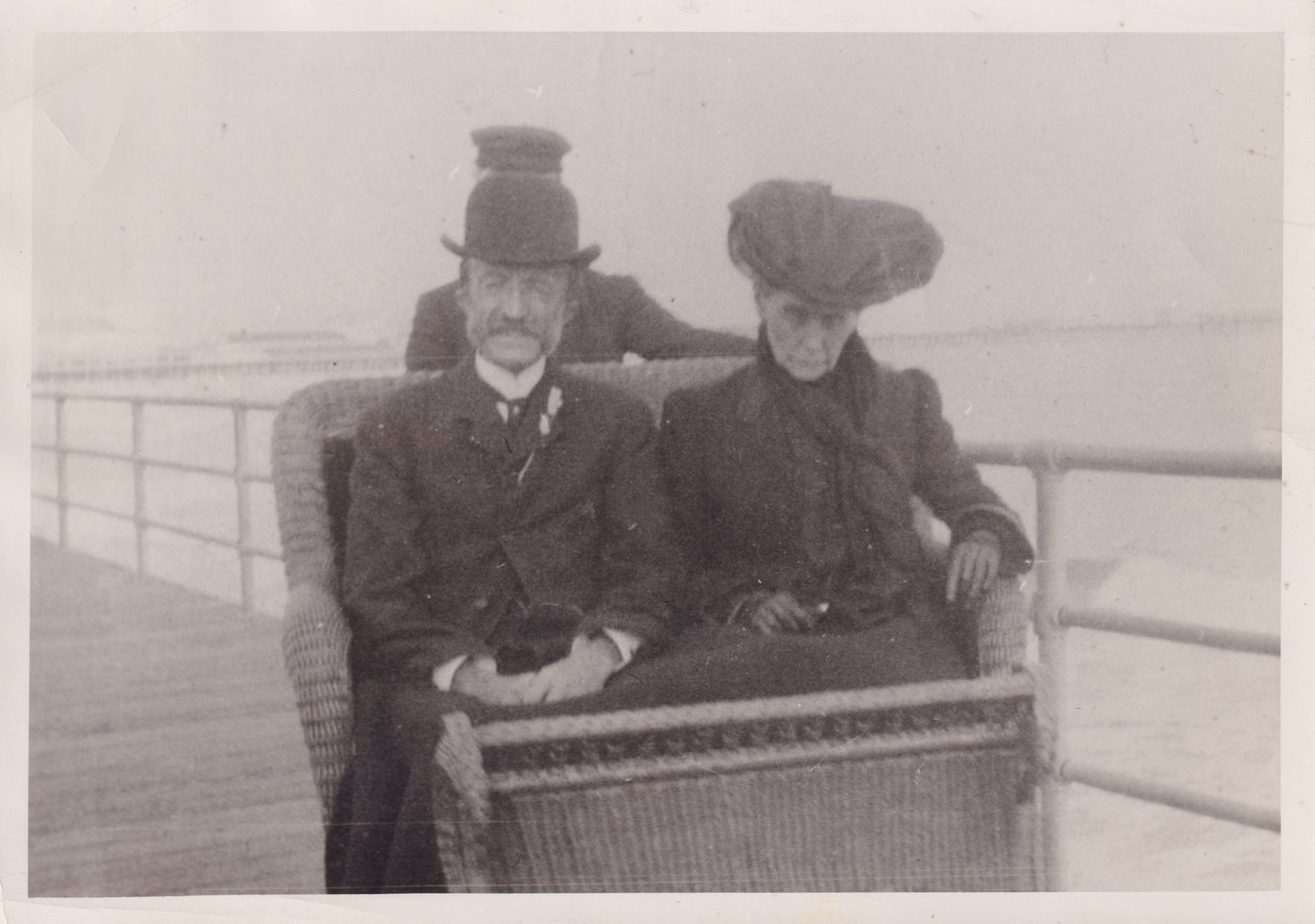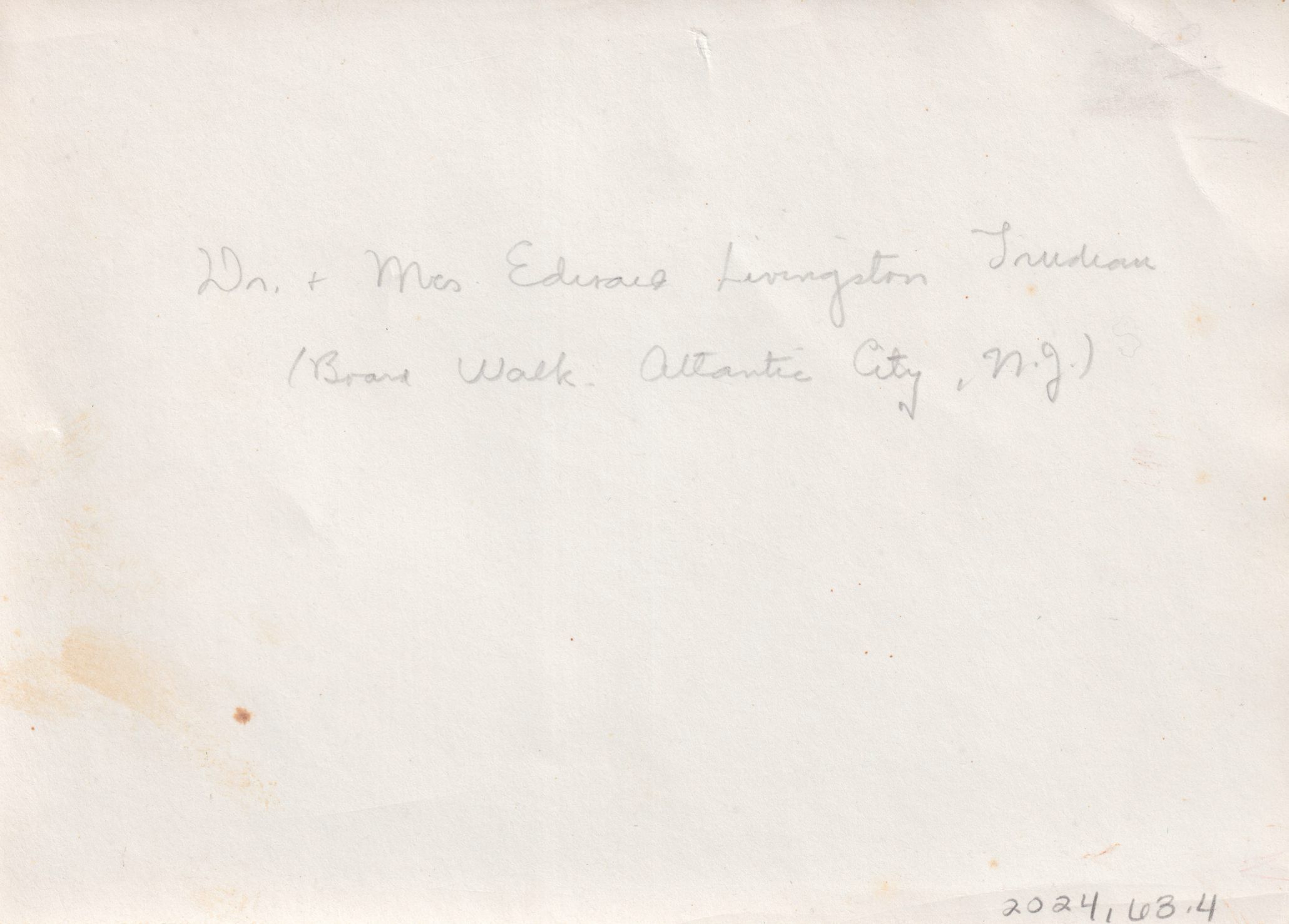 Black-and-White photograph of Edward Livingston Trudeau and Charlotte Beare Trudeau on the boardwalk in Atlantic City. They are seated in a two-person wicker wheelchair, with the ocean and buildings on the boardwalk visible behind them. Handwritten note on reverse reads, "Dr. & Mrs. Edward Livington Trudeau (Board walk Atlantic City, NJ)."