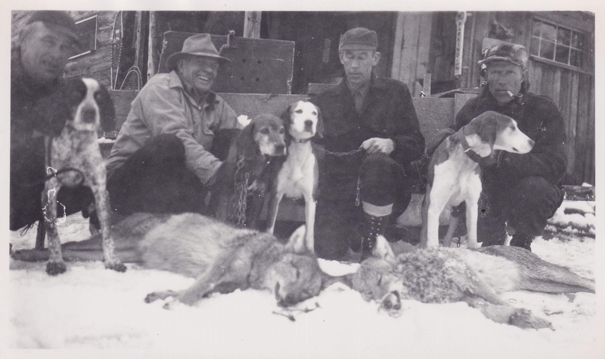 Black-and-White photograph of four unidentified men kneeling on the snowy ground with hunting dogs. There are two dead coyotes on the ground in front of them.