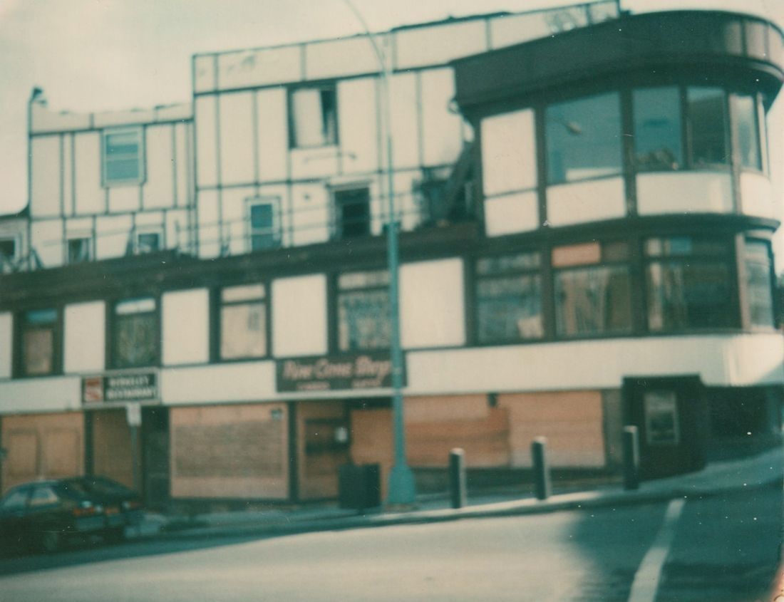 Photograph of the Berkeley Hotel after its second fire in January 1981. There is visible damage at the top of the building.