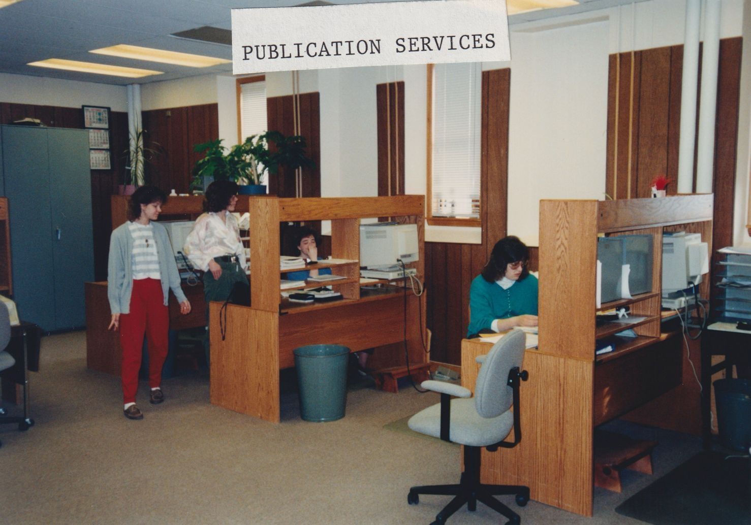 Color photograph of a four women in a room with three desks. Two of the women are standing around a third sitting at one of the desks. There is a label affixed to the front of the photograph that has "Publication Services" typewritten on it. This photograph is from an album of photographs taken at the American Management Association.