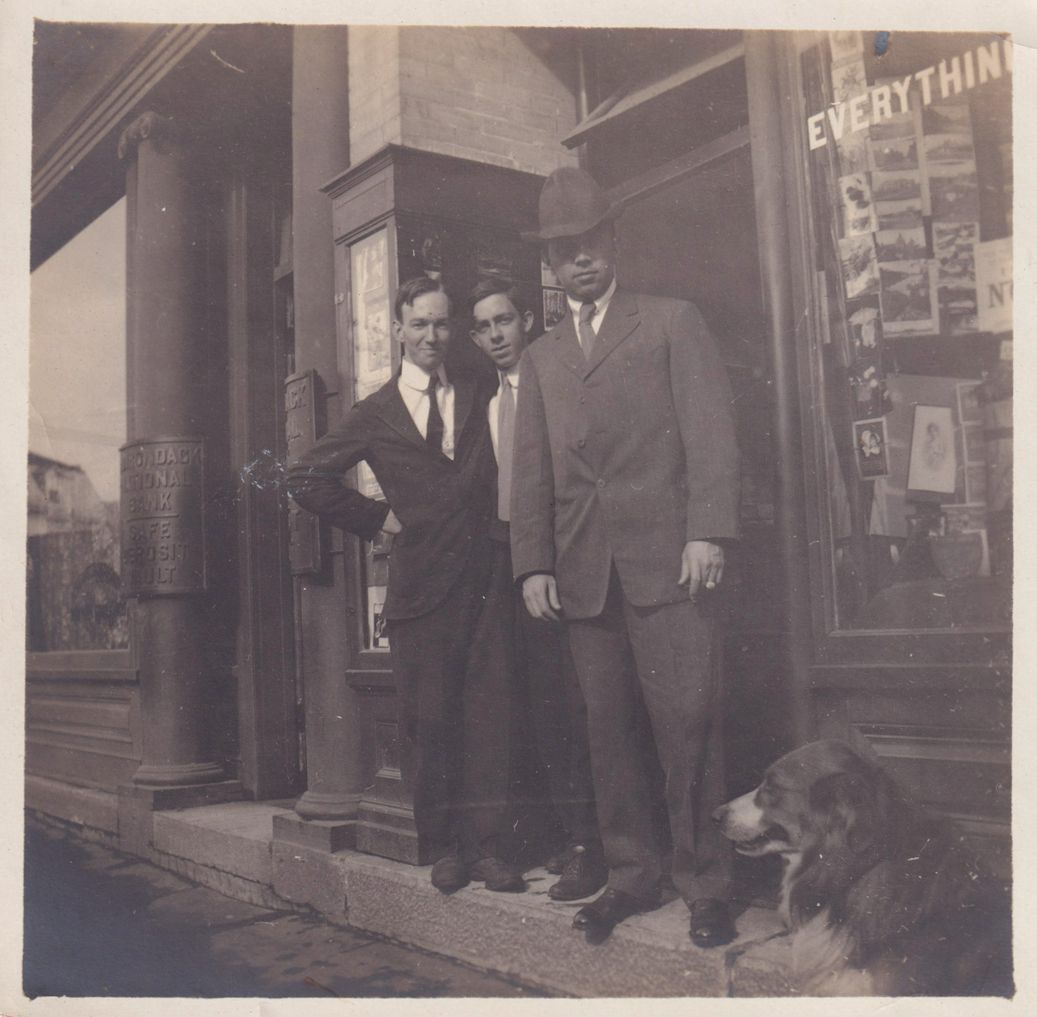 Black-and-White photograph of three unidentified men standing in a doorway of a building, likely next to Kollecker's Kodak and Gift Shop on Main Street. The shop window at right has a number of photographs or postcards, and the columns at left have large signs reading "Adirondack National Bank Safety Deposit Vault." There is a dog visible in the bottom right corner of the photograph. The photograph was printed by Kollecker's Kodak and Gift Shop.