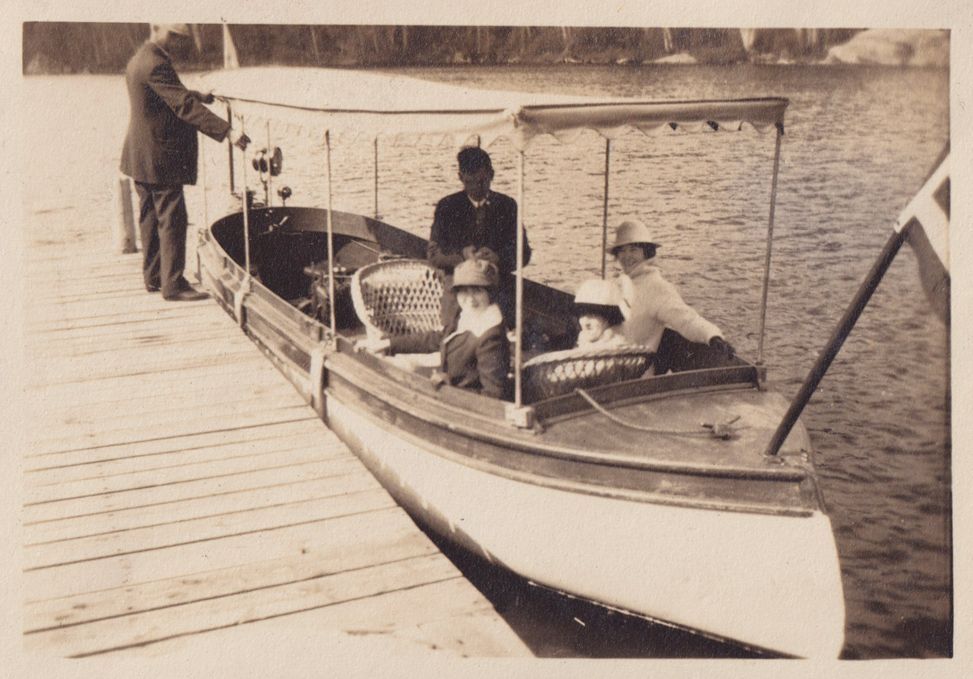 Black-and-white photograph of three women and one man sitting on a small boat docked on a lake. There appear to be flags on both the bow and stern ends of the boat. There is also a man standing on the dock getting ready to board the boat.