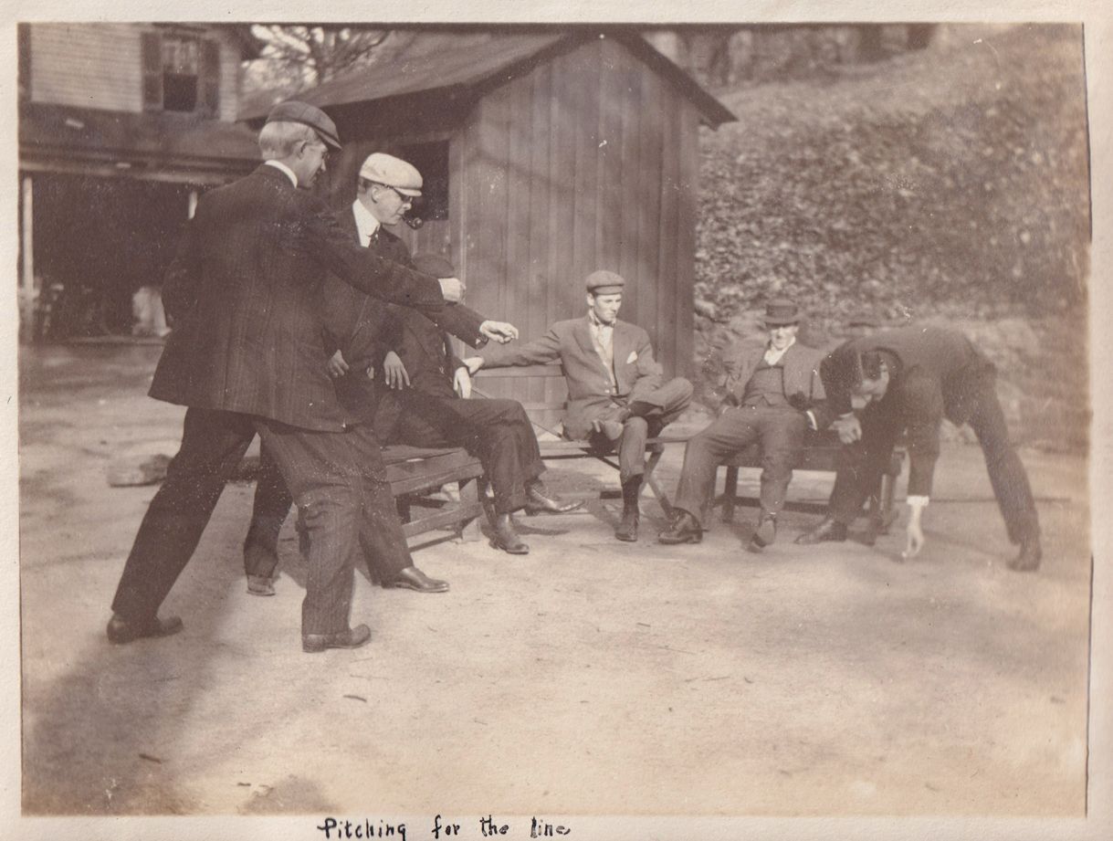 Black-and-white photograph of six men sitting on or standing next to a set of benches. The men who are standing appear to be playing a game involving throwing something small at an exact spot. There is a shed and house with a porch behind them. "Pitching for the line" is written in ink beneath the photograph.