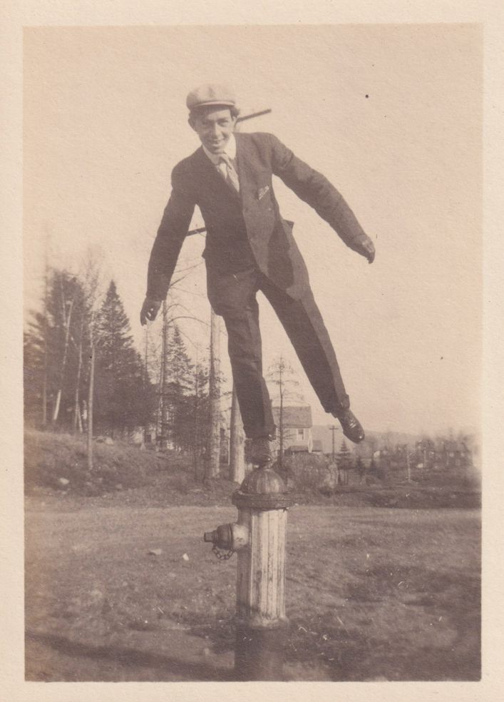 Black-and-White photograph of a man balancing on one foot on top of a fire hydrant. Was in an envelope marked, "Stickney - Saranac Lake." Photograph was developed by Kollecker's Kodak and Gift Shop. Negative is 2024.2.34.15.