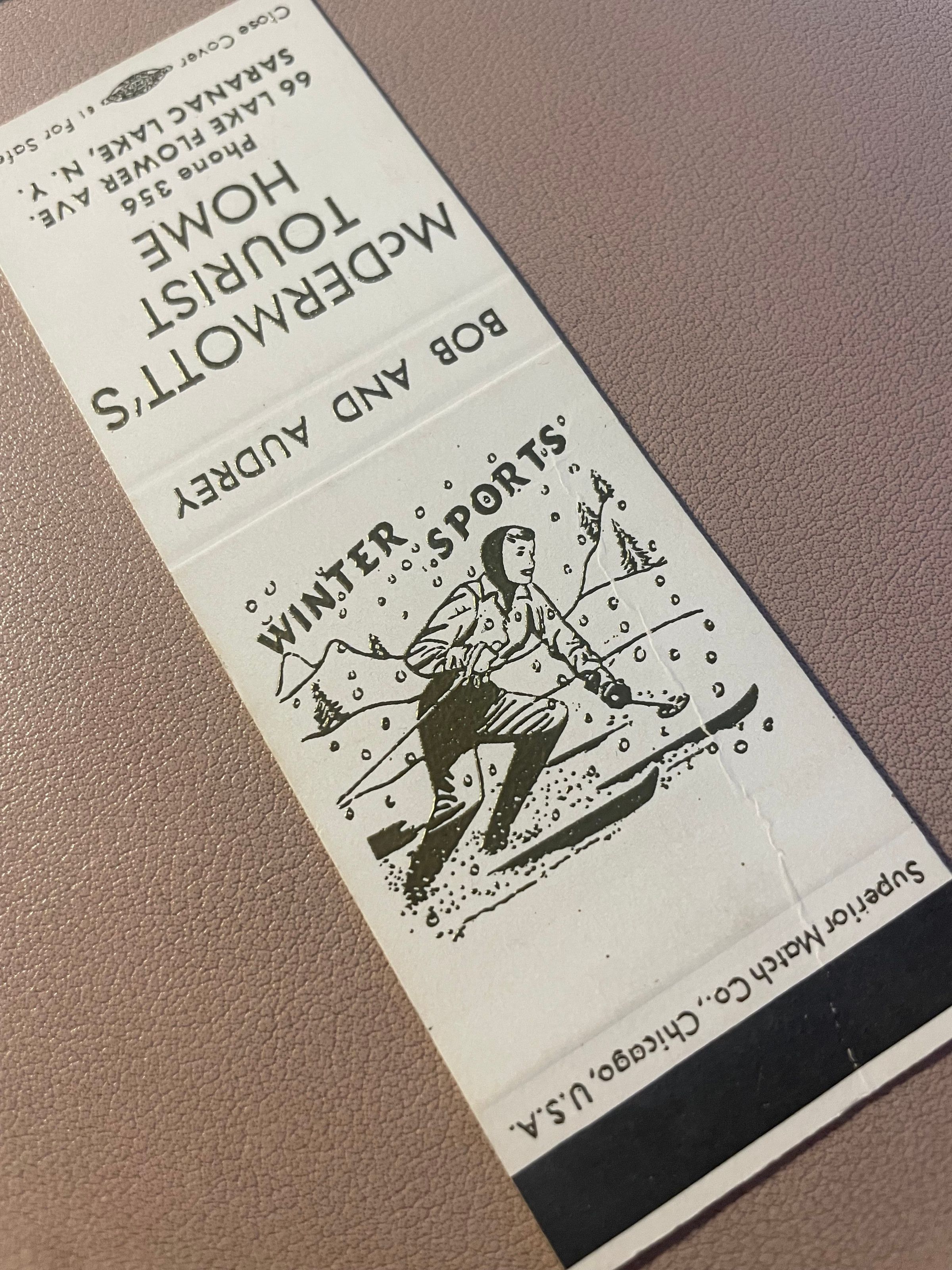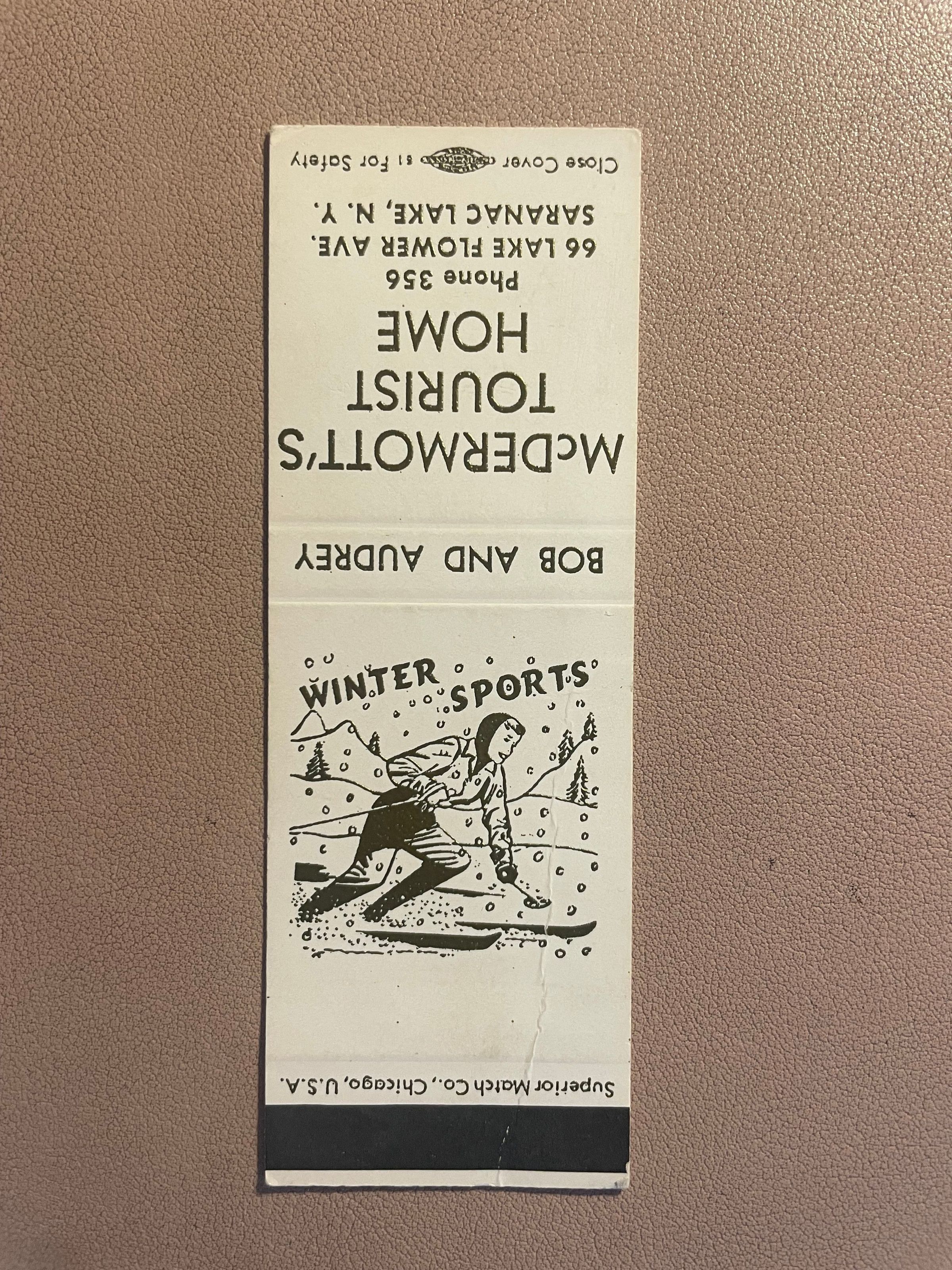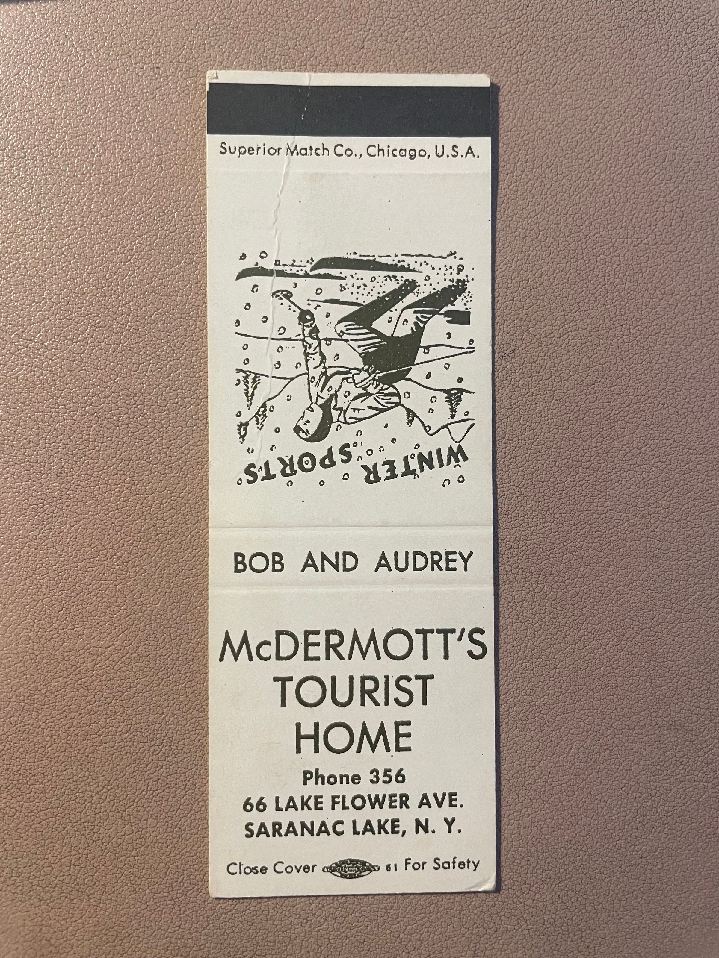 Matchbook cover advertising McDermott's Tourist Home at 66 Lake Flower Avenue. Front of over has name and contact information, top edge reads, "Bob and Audrey," and back reads, "Winter Sports," with drawing of a skier. All printed in raised gold ink. Matches have been removed.Lexicon
