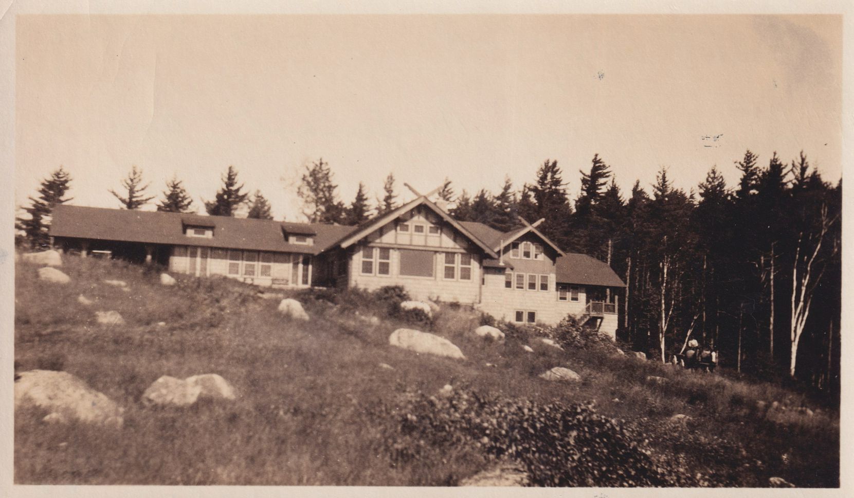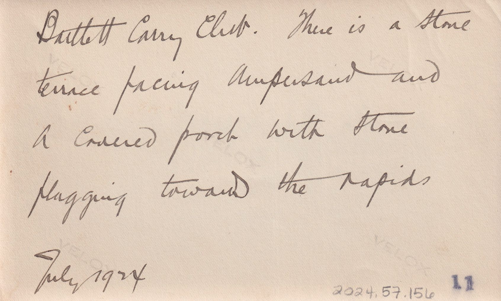 Black-and-White photograph of a large unidentified building at Bartlett Carry Club. Handwritten caption on reverse reads, "Bartlett Carry Club. There is a stone terrace facing Ampersand and a covered porch with stone flagging toward the rapids. July 1924."