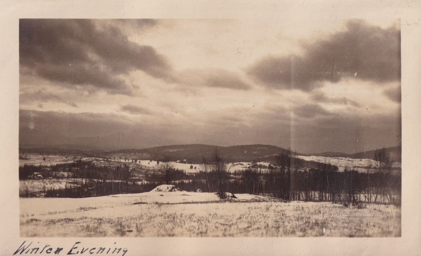 Black-and-white photograph of a snow-covered landscape with an open field, some thin brush, and a mountain in the distance. "Winter Evening" is written in ink at the bottom of the photograph.