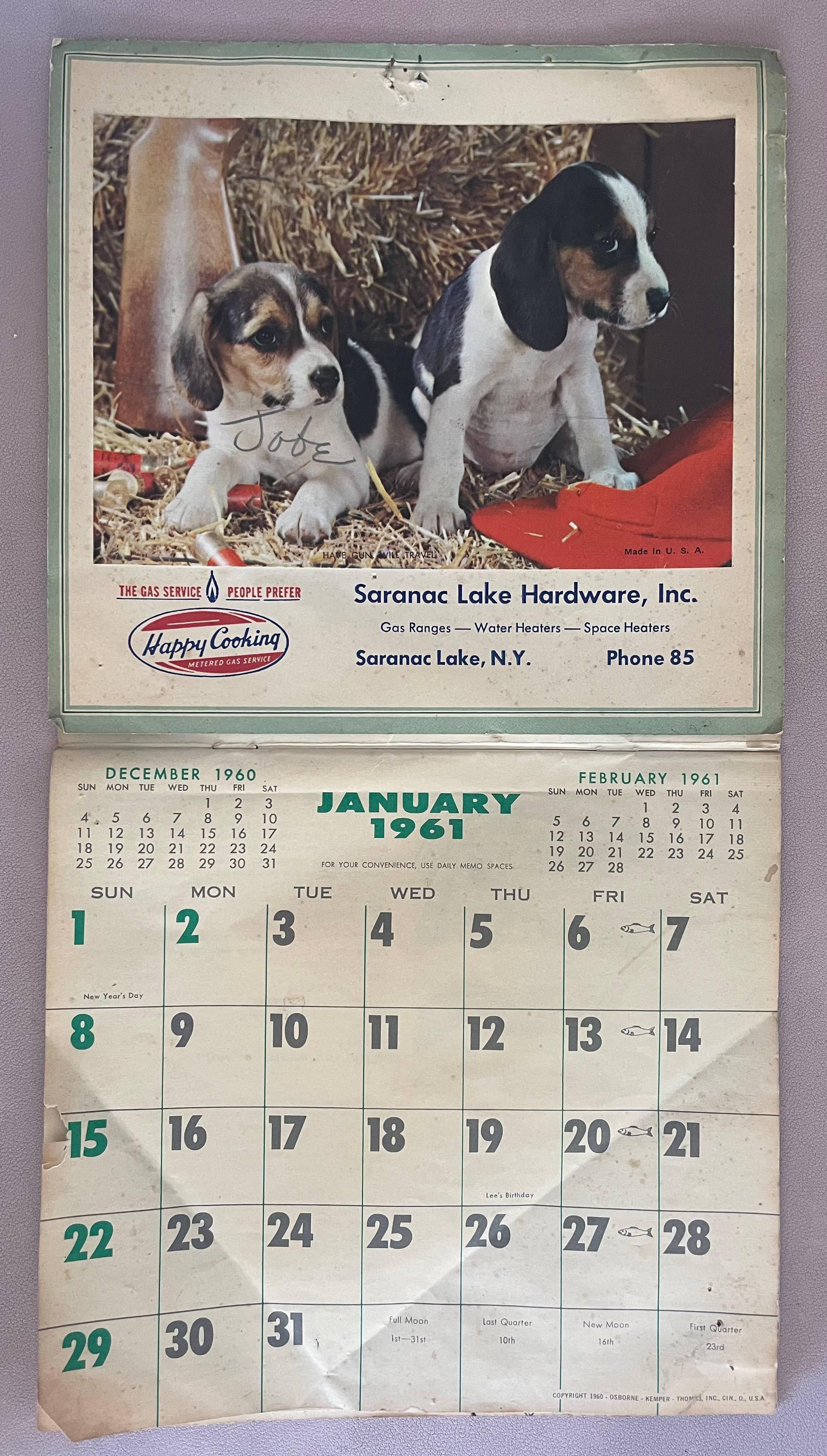1961 advertising calendar from Saranac Lake Hardware, Inc.. Has photograph of two puppies surrounded with hunting gear, with information about Saranac Lake Hardware printed underneath. Features "ideas for meals" with tips, recipes, and more printed on the backs of the calendar pages.