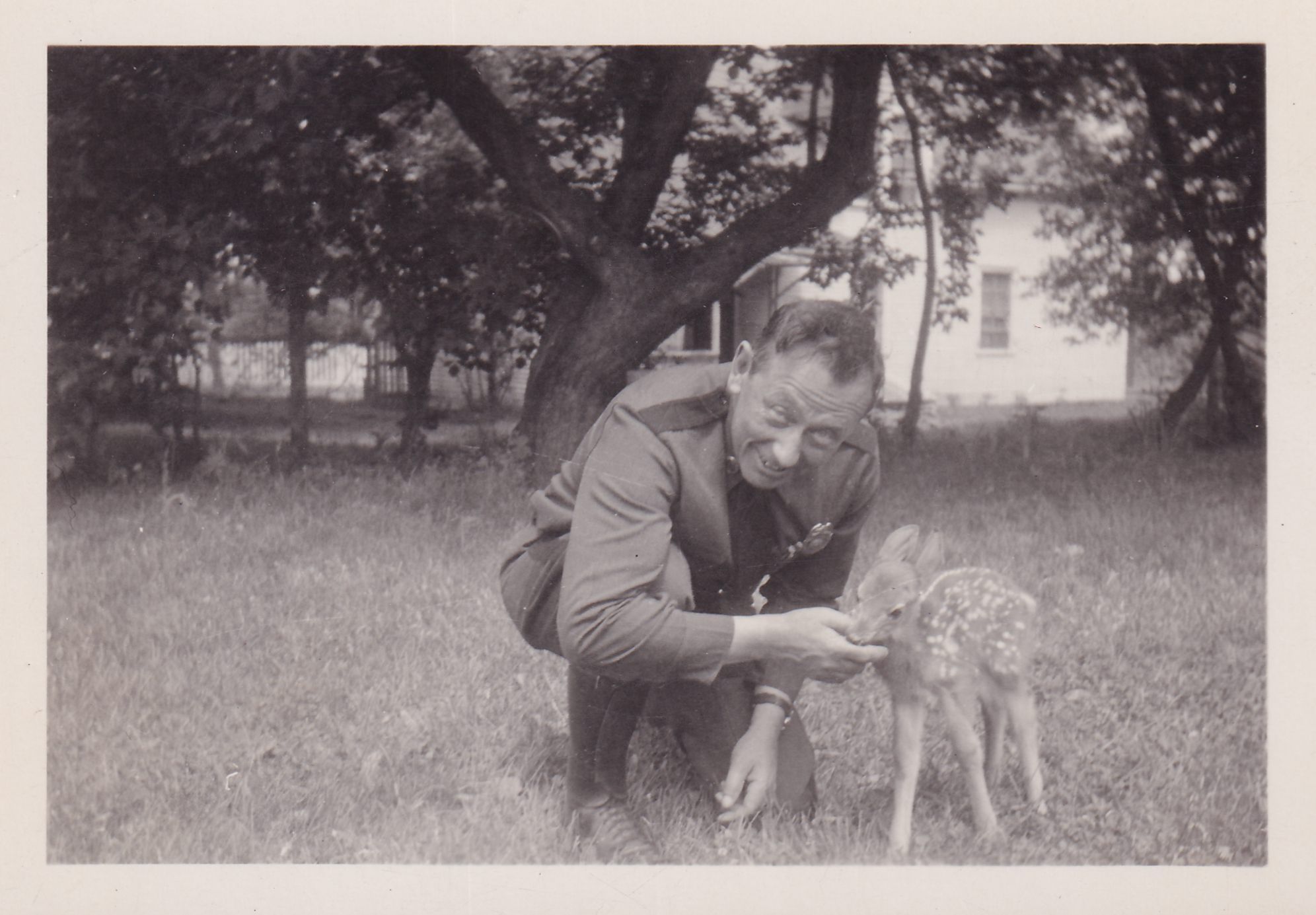 Black-and-White photograph of an unidentified man in a game warden uniform. He is kneeling down in the grass next to a fawn.