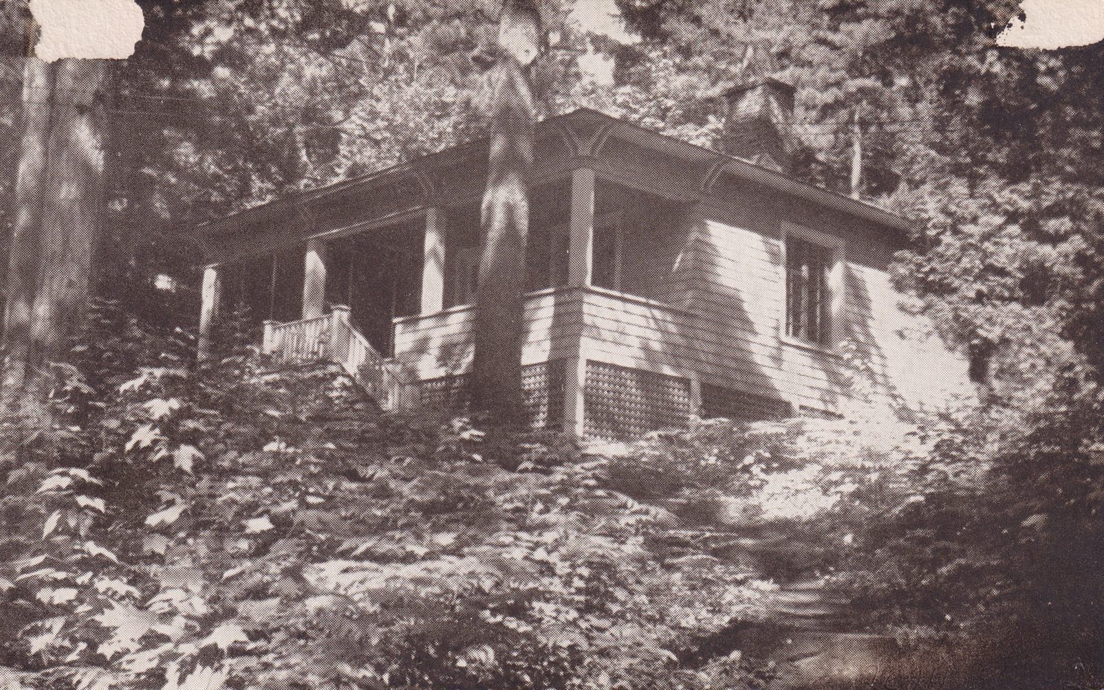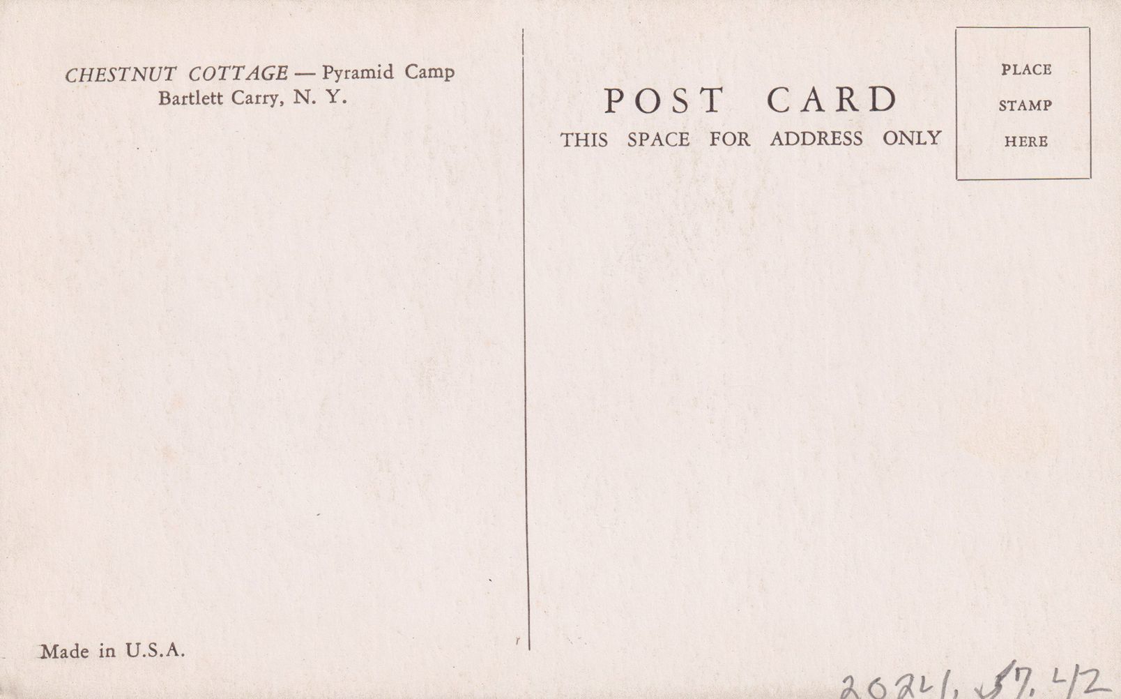 Black-and-White postcard showing the Chestnut Cottage at Pyramid Camp (AKA Bartlett Carry Camp). No printer's mark. Unused, divided back.