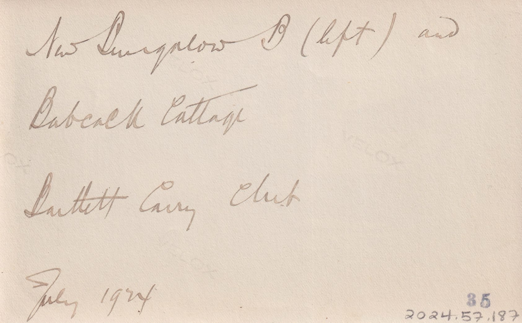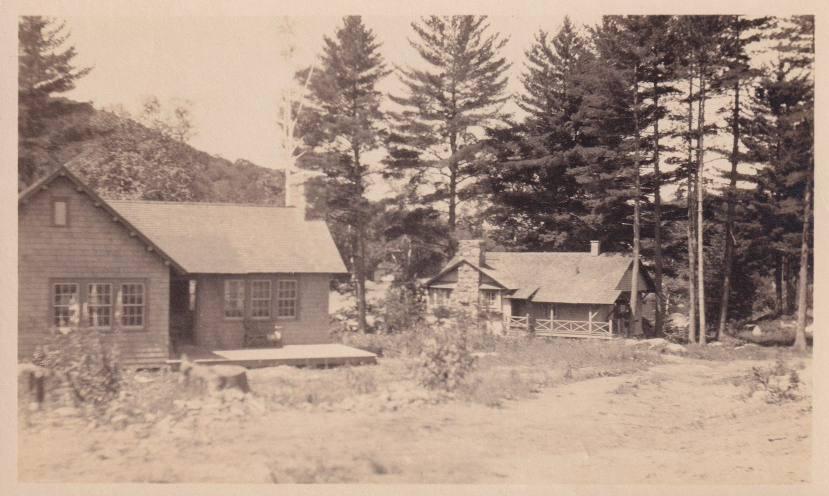 Black-and-White photograph of two cottages at Bartlett Carry Club. Handwritten note on reverse reads, "New Bungalow B (left) and Babcock Cottage. Bartlett Carry Club. July 1924."