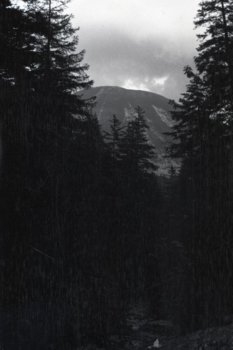 Negative of a mountain seen through pine trees. Most likely taken by Mary Ives Baldwin. This item is not fully cataloged but has been uploaded so the image is publicly available; if you would like us to prioritize cataloging this item, please contact the HSL Collections team.