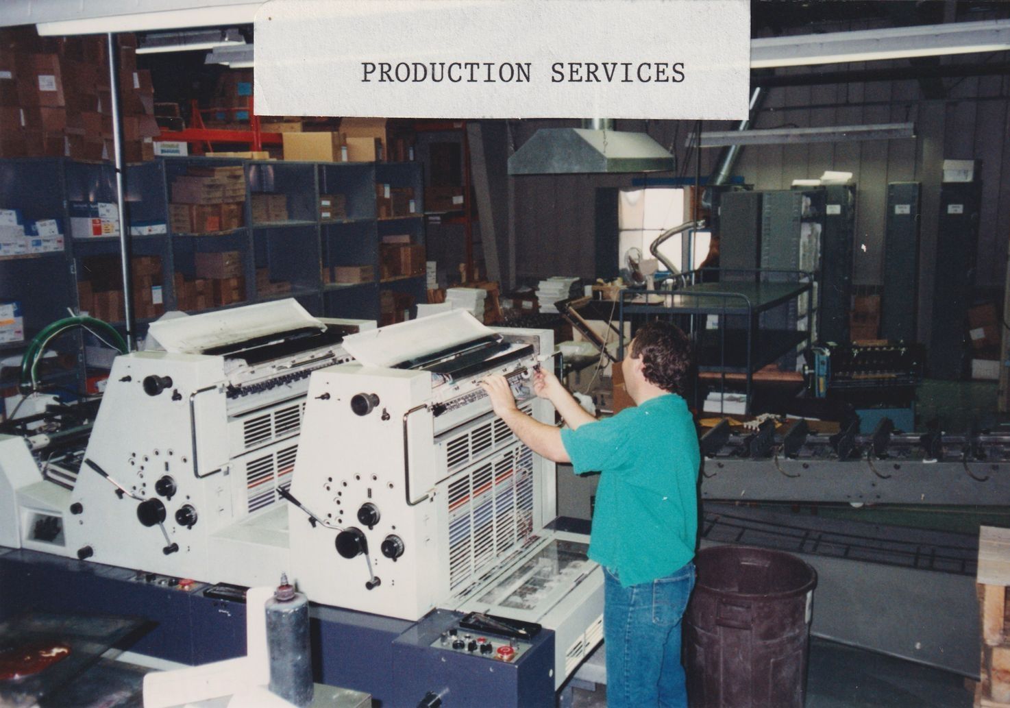 Color photograph of a man in a large room standing in front of a large machine, likely a printer. There are many stacks of cardboard boxes behind him. There is a label affixed to the front of the photograph that has "Production Services" typewritten on it. This photograph is from an album of photographs taken at the American Management Association.