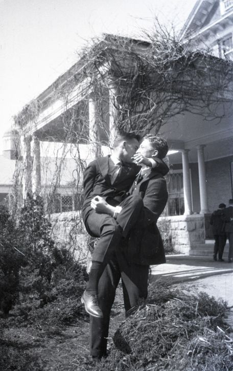 Negative of two unidentified young men standing outside of a building in suits. One is holding the other. Most likely taken by Mary Ives Baldwin. This item is not fully cataloged but has been uploaded so the image is publicly available; if you would like us to prioritize cataloging this item, please contact the HSL Collections team.