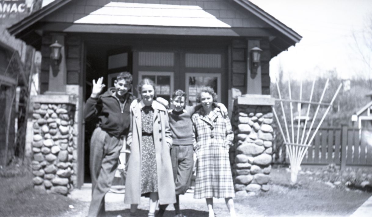 Black-and-White negative of photograph of four young people standing in front of an unidentified garage. They all have their arms around each other and one is waving to the camera. The bottom right corner of the Hotel Saranac sign is visible in the distance.