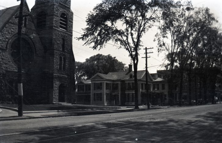 Negative of a street view with a brick church and large house in view. There are thin trees in front of the buildings. Most likely taken by Mary Ives Baldwin. This item is not fully cataloged but has been uploaded so the image is publicly available; if you would like us to prioritize cataloging this item, please contact the HSL Collections team.
