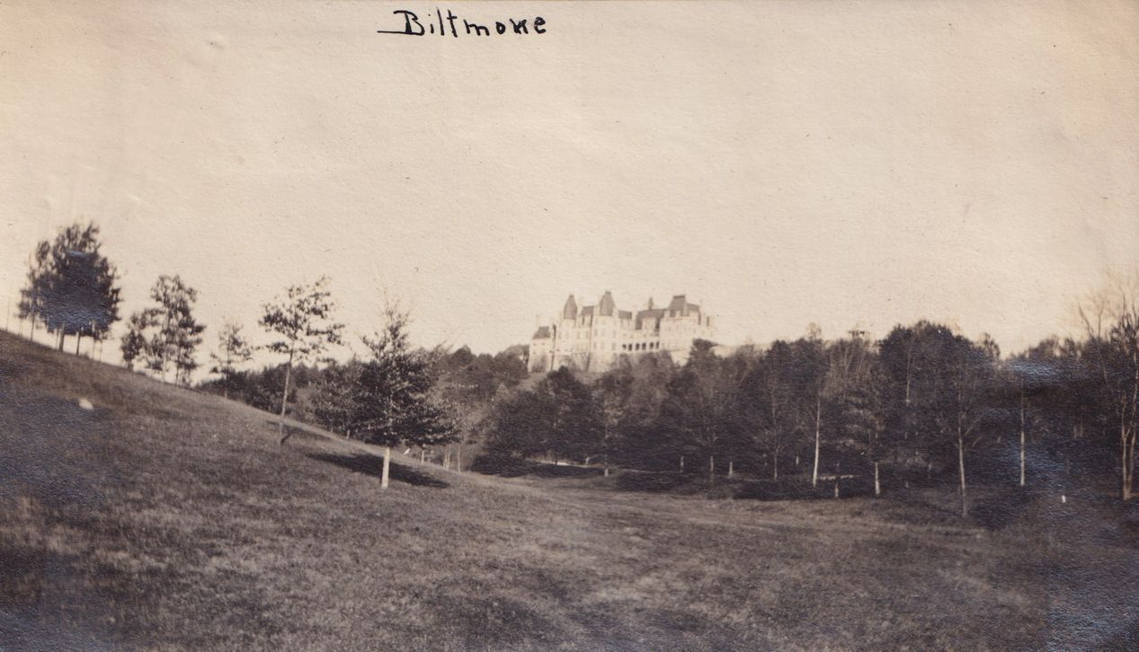Black-and-white photograph of a grassy landscape with some trees in the distance. Visible above the tree line is the Biltmore Estate, located in Asheville, North Carolina. "Biltmore" is written in ink at the top of the photograph.