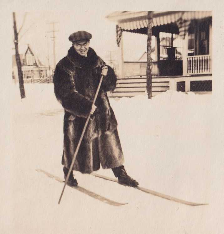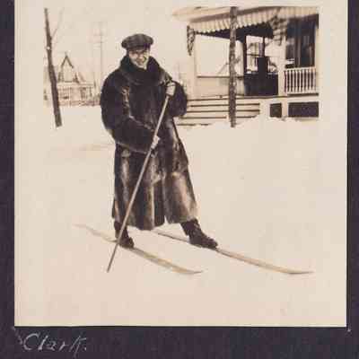 Black-and-white photograph of a man in winter gear on skis with a pole in his hands. He is on a snow-covered Shepard Avenue with Kennedy Cottage behind him. "Clark" is written in white underneath the photograph.