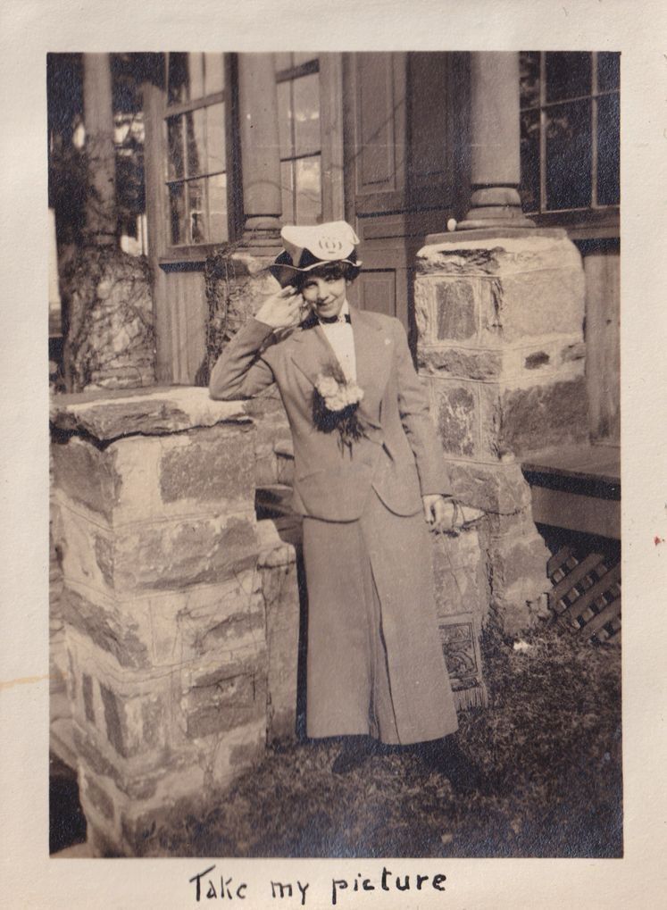 Black-and-white photograph of a woman leaning against a stone railing next to front steps leading to a house. "Take my picture" is written in ink beneath the photograph.