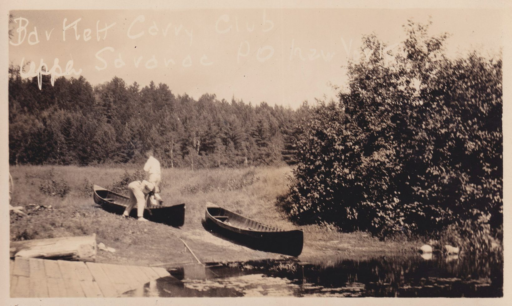 Black-and-White photograph of two people standing near guideboats on the edge of a body of water. Handwritten note, "Bartlett Carry Club, Upper Saranac PO New York," has been printed on the image.