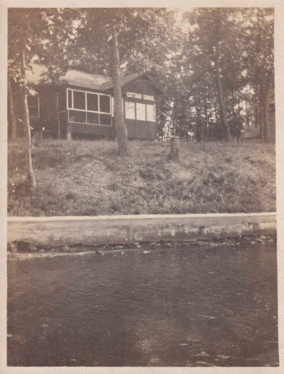 Black-and-White photograph of the shore of an unidentified body of water. A small cabin can be seen up the hill, with large lettering reading, "Cottage Grove," below the roofline.
