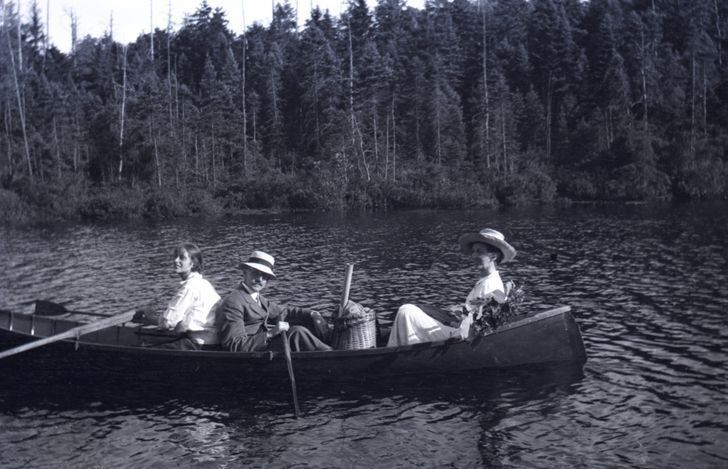Negative of three people sitting in a canoe or guideboat on a lake, taken from another boat. The man in the middle is likely J. Woods Price. Most likely taken by Mary Ives Baldwin. This item is not fully cataloged but has been uploaded so the image is publicly available; if you would like us to prioritize cataloging this item, please contact the HSL Collections team.