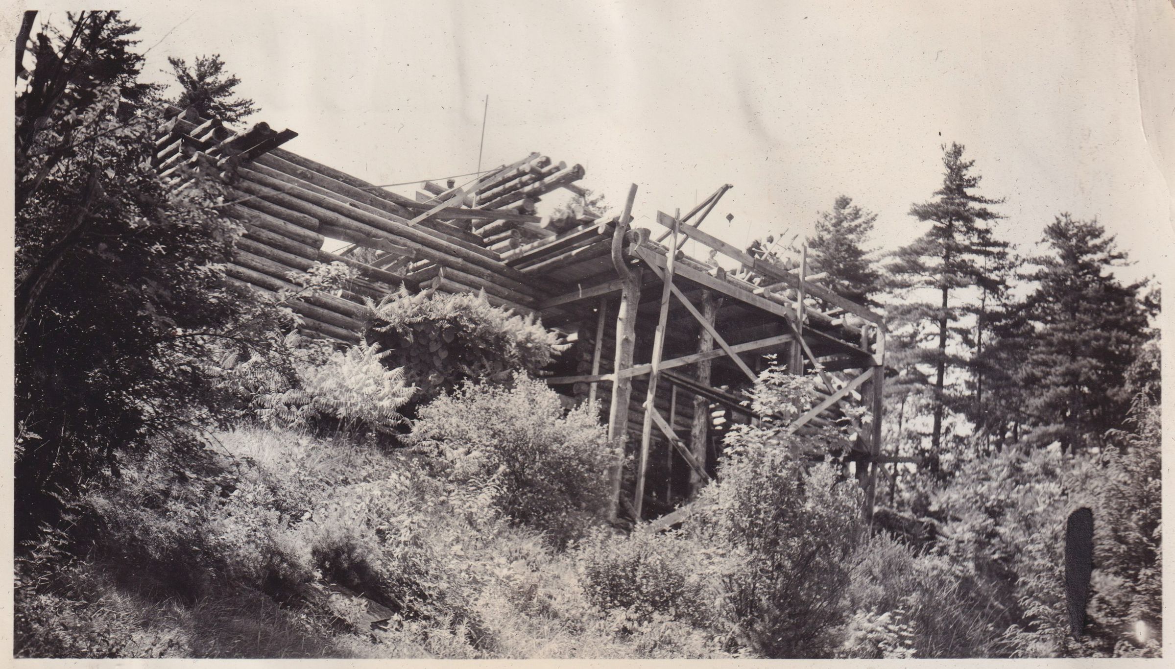 Black-and-White photograph of a view looking up at a partially built log cabin, surrounded by trees.
