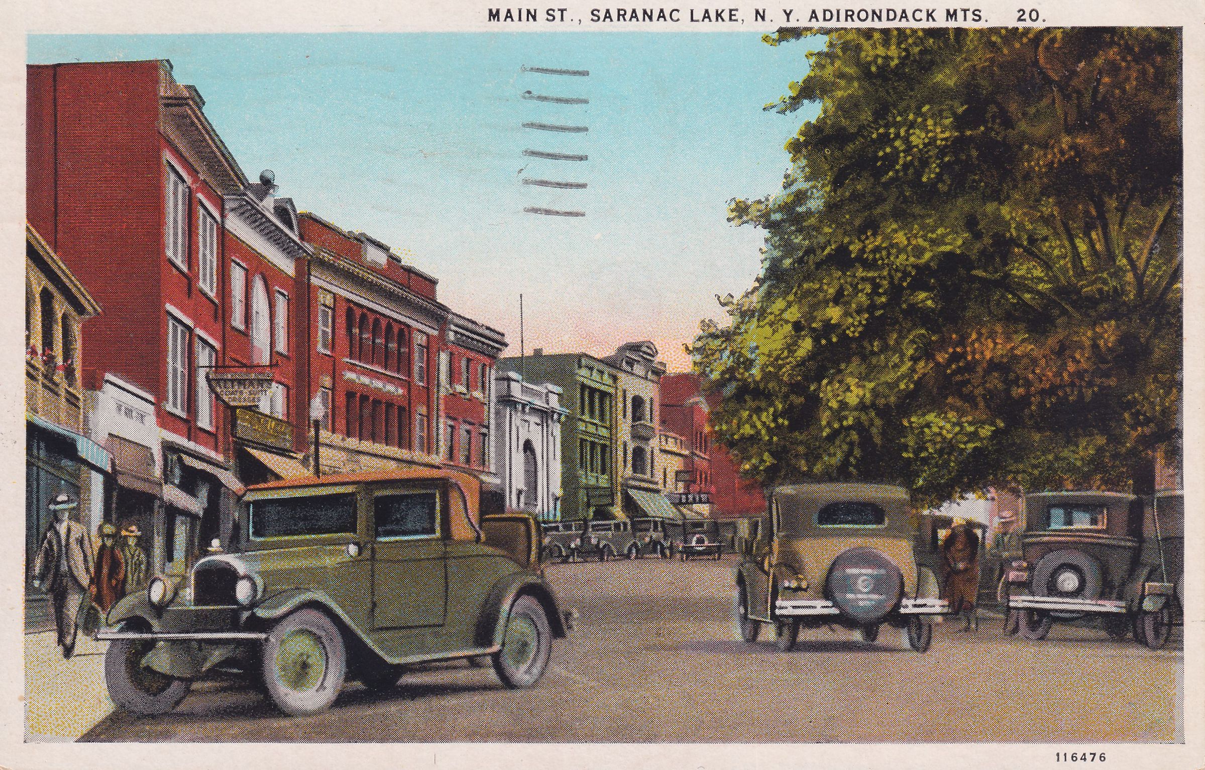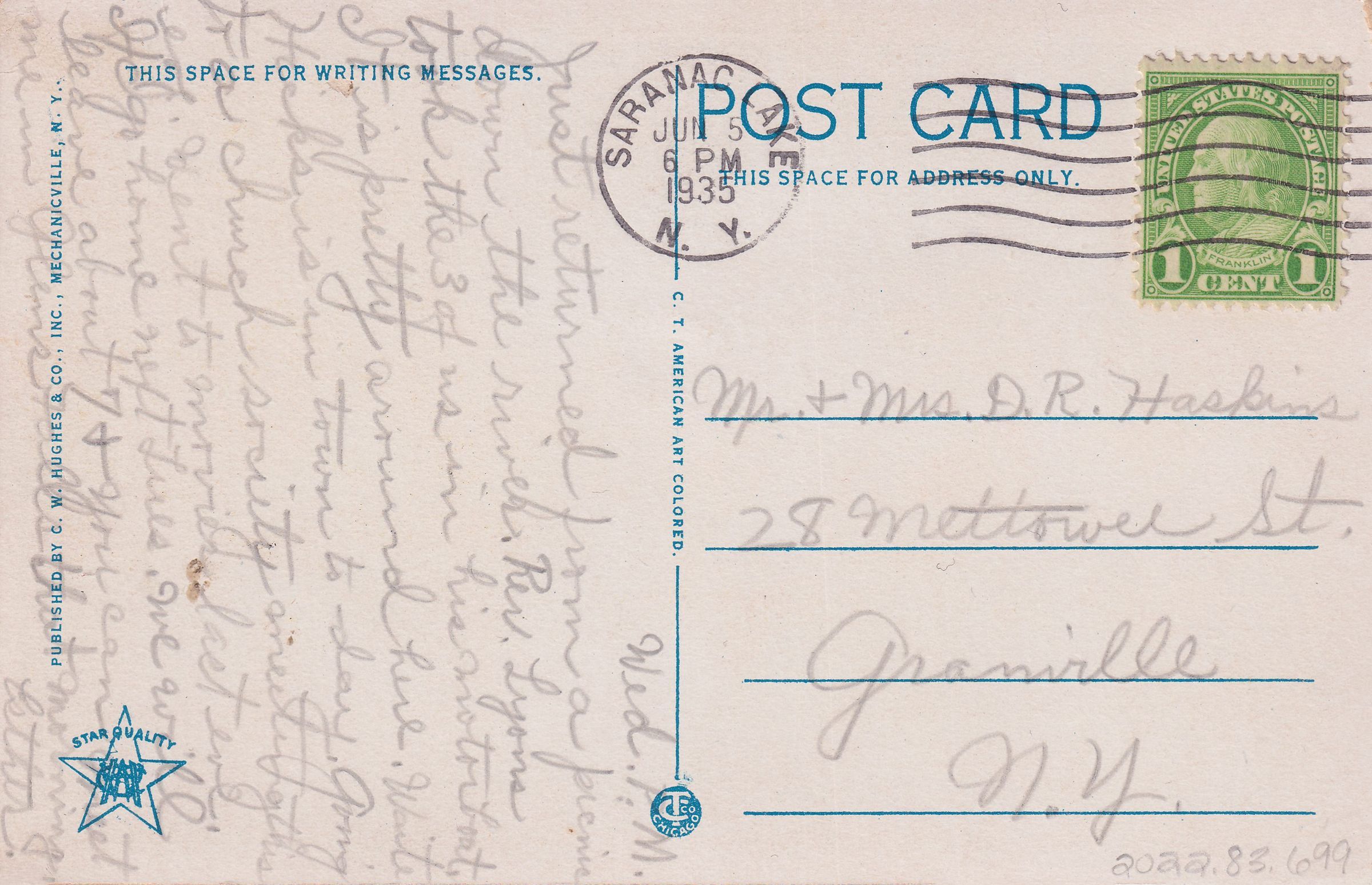 Color postcard showing cars and businesses in downtown Saranac Lake. Printed caption on front reads, "Main St., Saranac Lake, N. Y. Adirondack Mts." Printed by C.W. Hughes & Co., Mechanicville, NY. Used, divided back, white border, postmarked Saranac Lake, NY, June 5, 1935. Handwritten message on back reads, "Wed PM, Just returned from a picnic down the river. Rev. Lyons took the 3 of us in the motorboat. It is pretty around here. Waite Hicks is in town to day. Going to a church society meeting this eve. Went to movies last eve. If I go home next Tues we will leave about 7 & you can meet me in Glens Falls that morning. Esther." Mailed to Mr. & Mrs. D. R. Haskins, 28 Mettowee St., Granville, NY.Subject Place