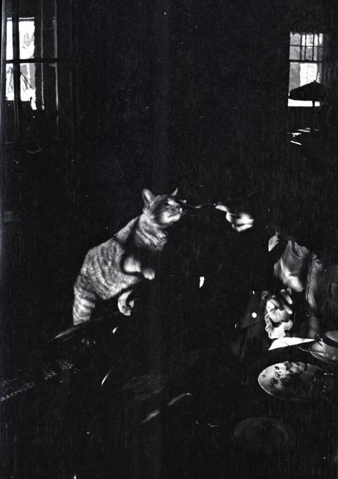 Negative of a cat standing on a bench with his front paws on the top of the pack rest. The cat is leaning toward a spoon or something held in the hand of an unidentified person who is sitting too deeply in shadow to make out. Most likely taken by Mary Ives Baldwin. This item is not fully cataloged but has been uploaded so the image is publicly available; if you would like us to prioritize cataloging this item, please contact the HSL Collections team.