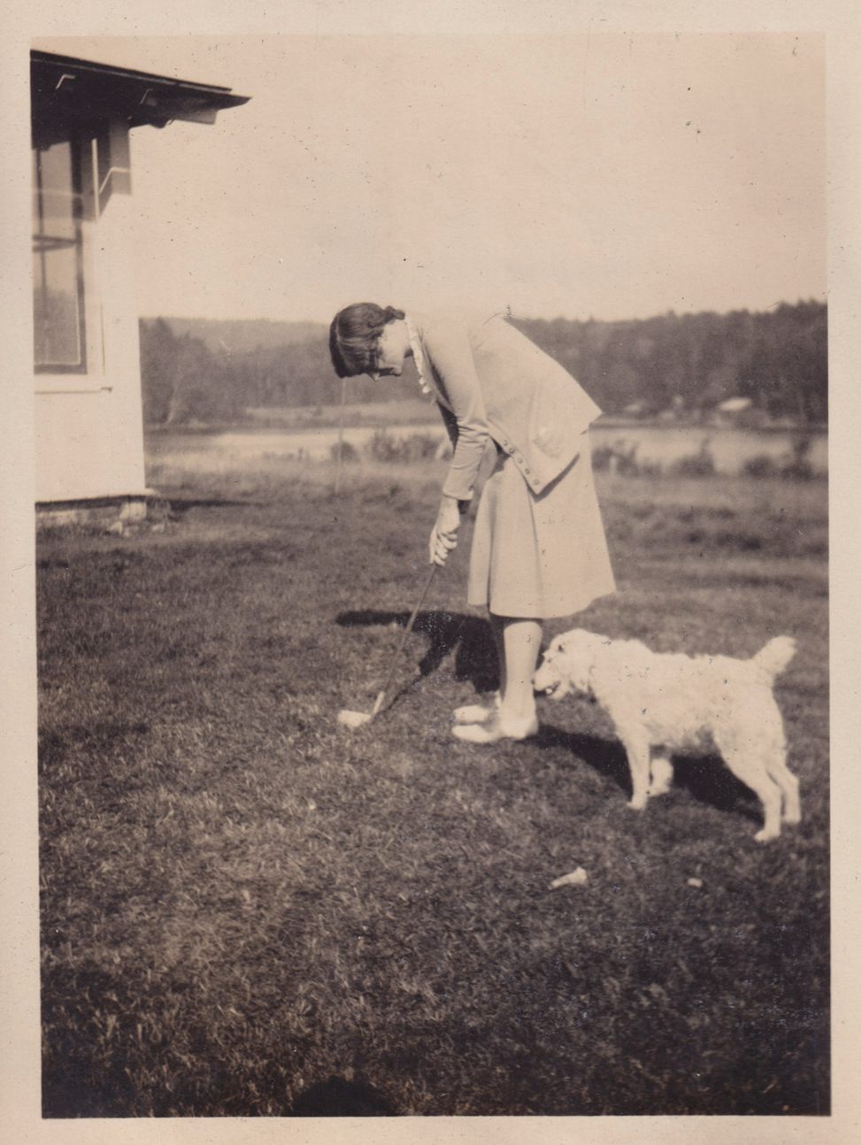 Black-and-White photograph of an unidentified woman golfing. The Jones Family's dog, Peggy, is standing next to her.