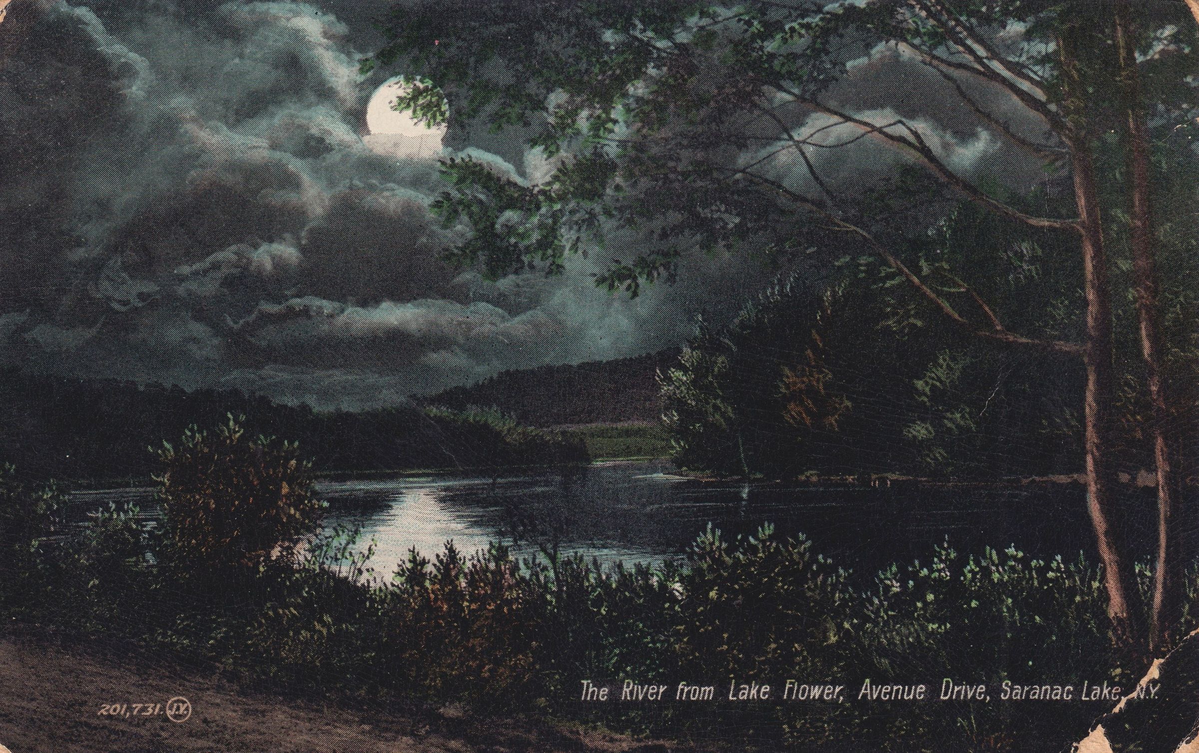 Color postcard showing a nighttime view of Lake Flower with the moon shining through the clouds. Printed caption on front reads, "The River from Lake Flower, Avenue Drive, Saranac Lake." Printed by the Valentine & Sons' Publishing Co., Ltd., New York. Used, divided back, postmarked Saratoga Sprints, November 27, 1909.
