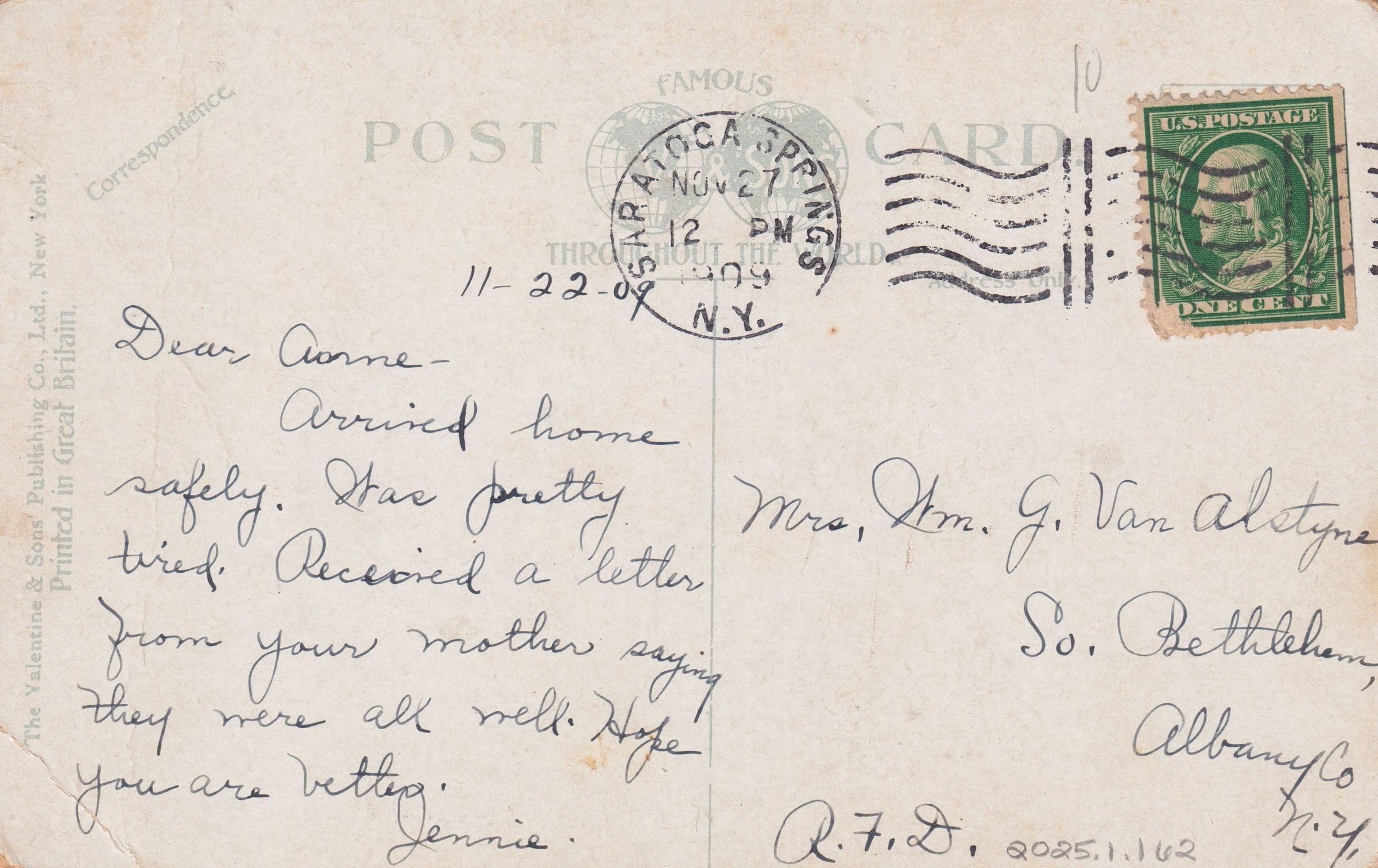 Handwritten message on reverse reads, "11-22-09. Dear Anne- Arrived home safely. Was pretty tired. Received a letter from your mother saying they were all well. Hope you are better. Jennie." Mailed to Mrs. Wm. G. Van Alstyne, So. Bethlehem, Albany Co., NY, R. F. D.Subject Place