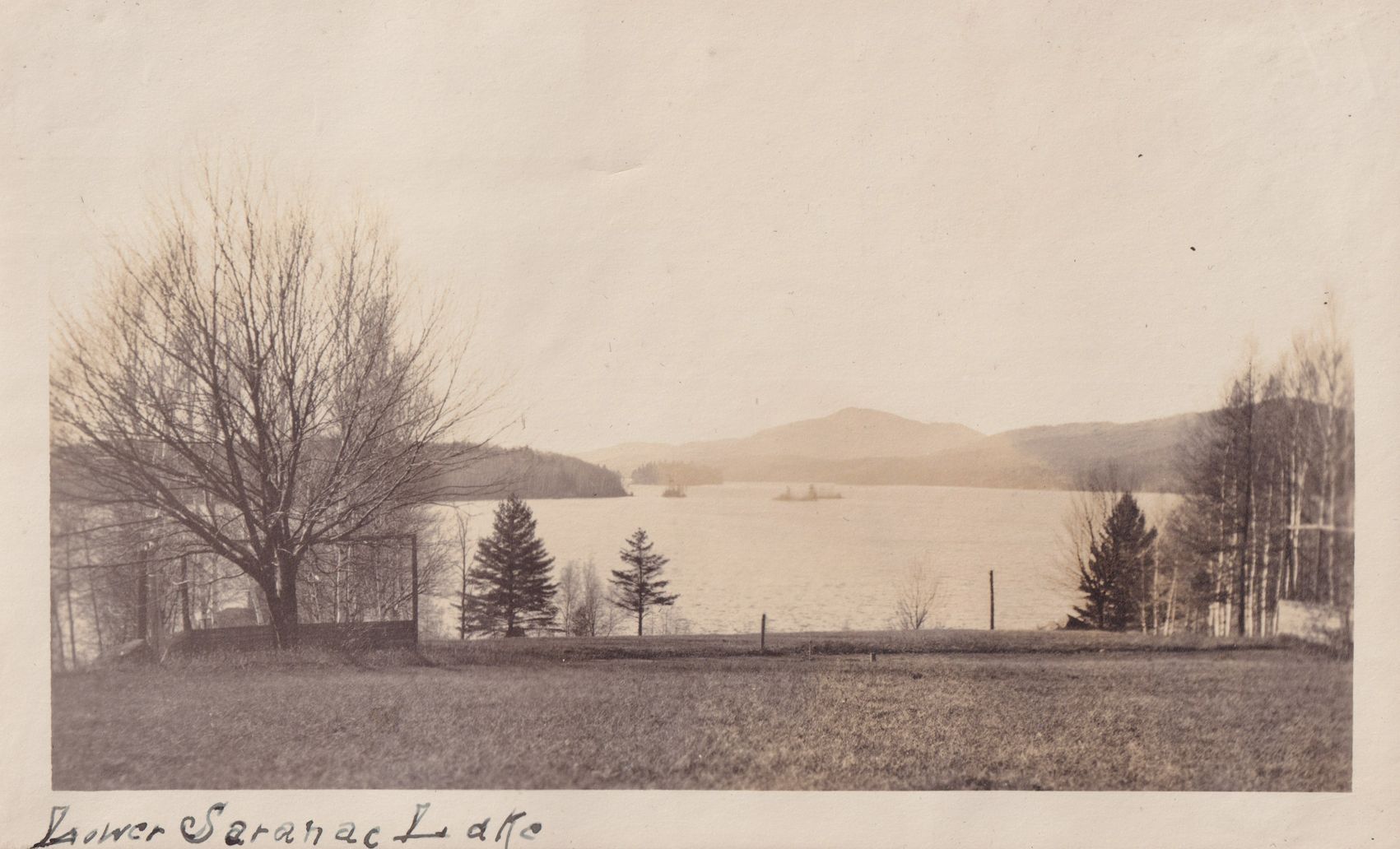 Black-and-white photograph of a lake, taken from a grassy area near one of the shores. Trees and a mountain are visible across the lake, and there are a few small islands on the lake itself. "Lower Saranac Lake" is written in ink at the bottom of the photograph.