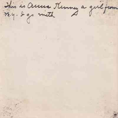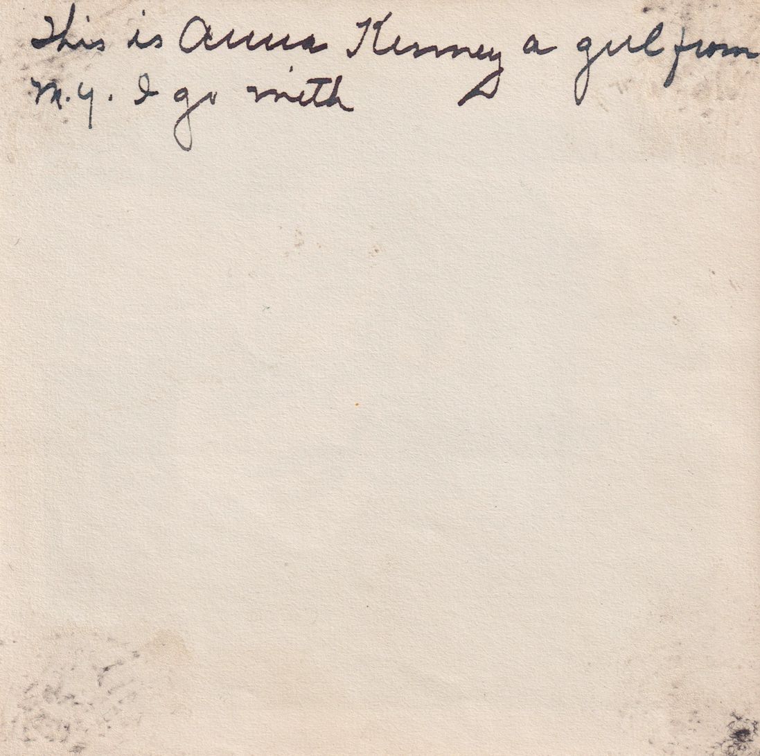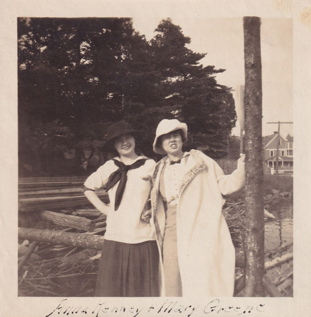 Black-and-white photograph of two women standing next to a skinny tree with a pile of other felled trees behind them, perhaps sitting on top of a river running behind them. "Anna Kenney + Mary Greene" is written in ink at the bottom of the photograph. "This is Anna Kenney a girl from N.Y. I go with" is written on the back of the photograph.