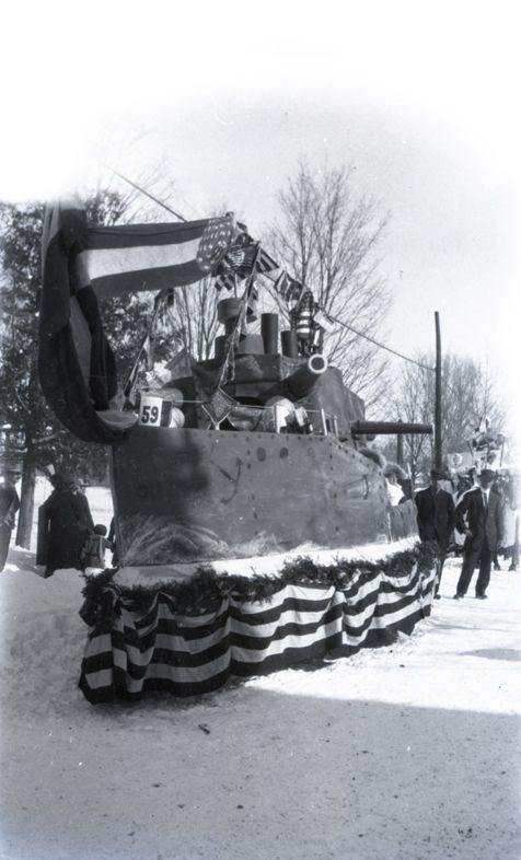 Negative of a Winter Carnival parade float shaped like a tank with a large American flag pennant and bunting at the bottom. There is a small black "59" printed on white paper attached to the float. Most likely taken by Mary Ives Baldwin. This item is not fully cataloged but has been uploaded so the image is publicly available; if you would like us to prioritize cataloging this item, please contact the HSL Collections team.