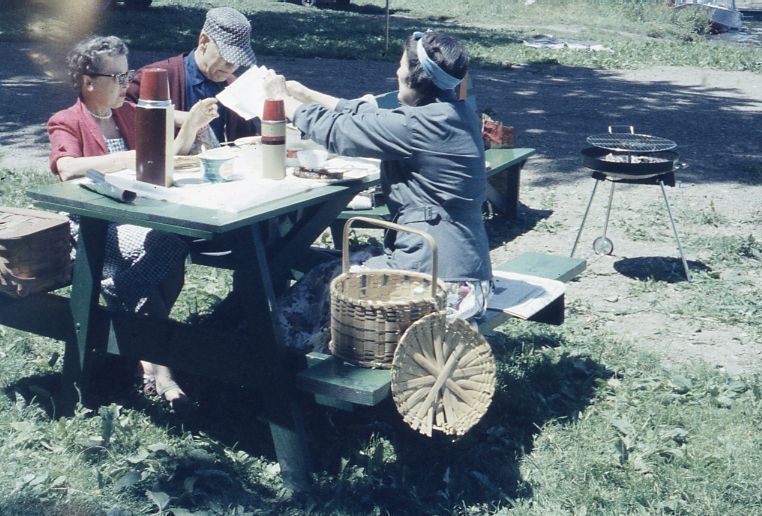 Color Anscochrome slide showing people eating at a picnic table. From a group of vacation slides taken by an unidentified family.