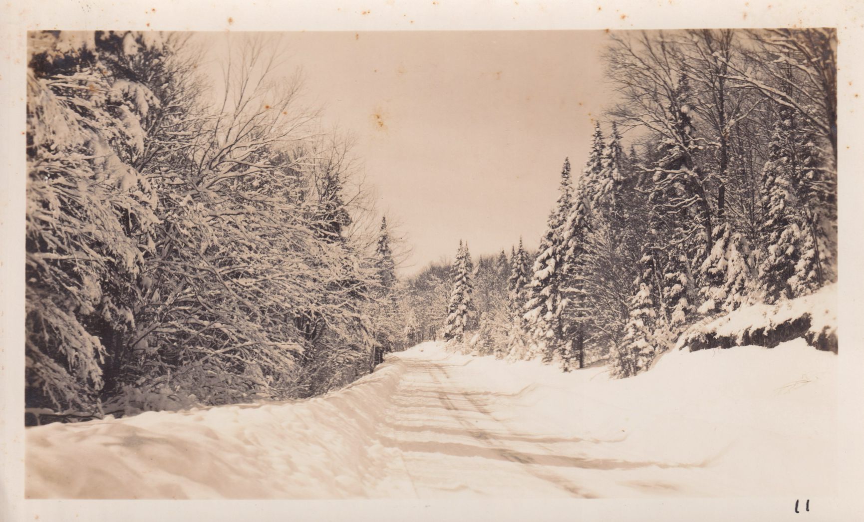 Black-and-White photograph of a snowy road lined with evergreen trees. "11" is written in pen in the bottom right corner. The photograph was likely printed by Kollecker's Kodak and Gift Shop.