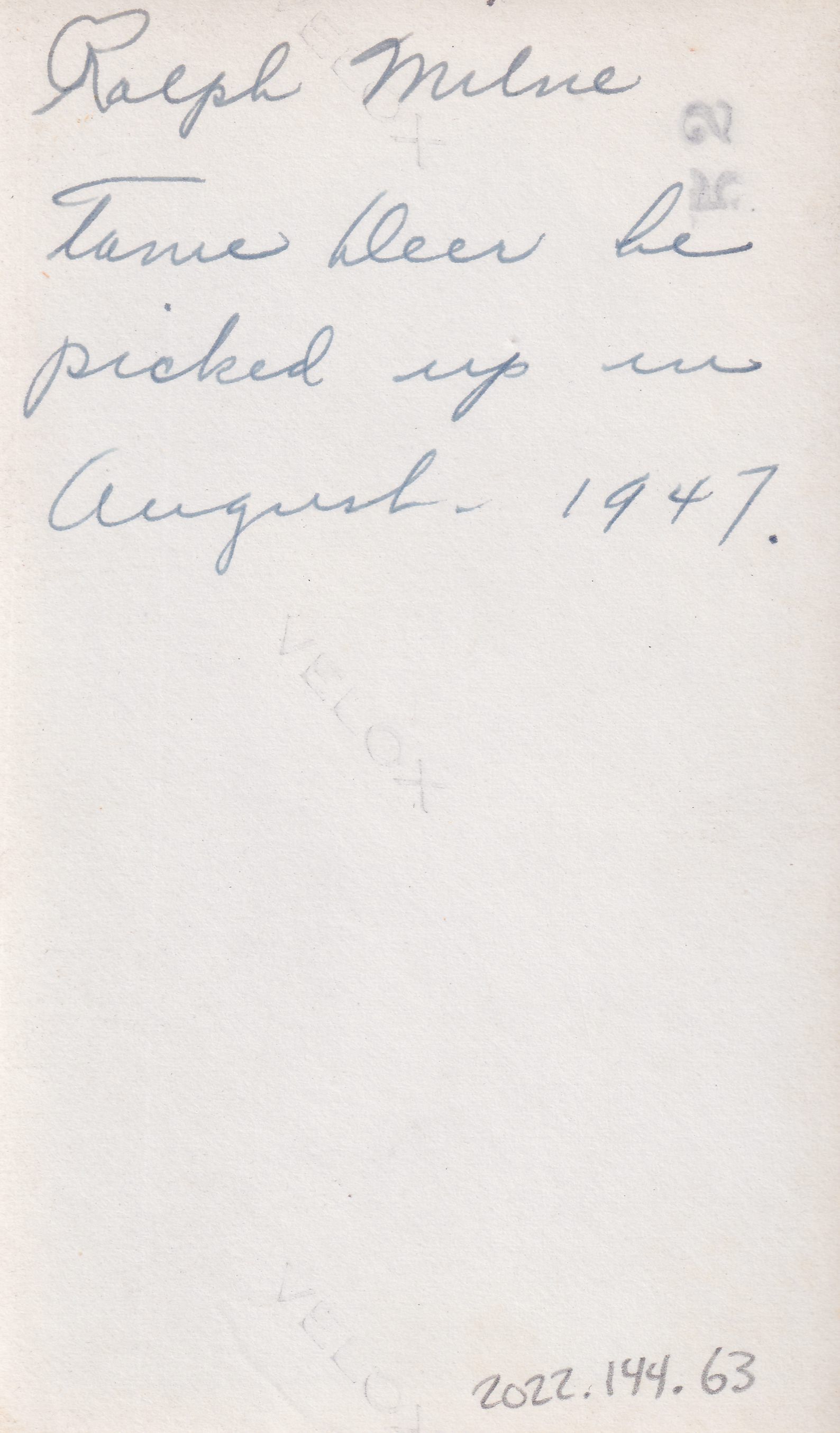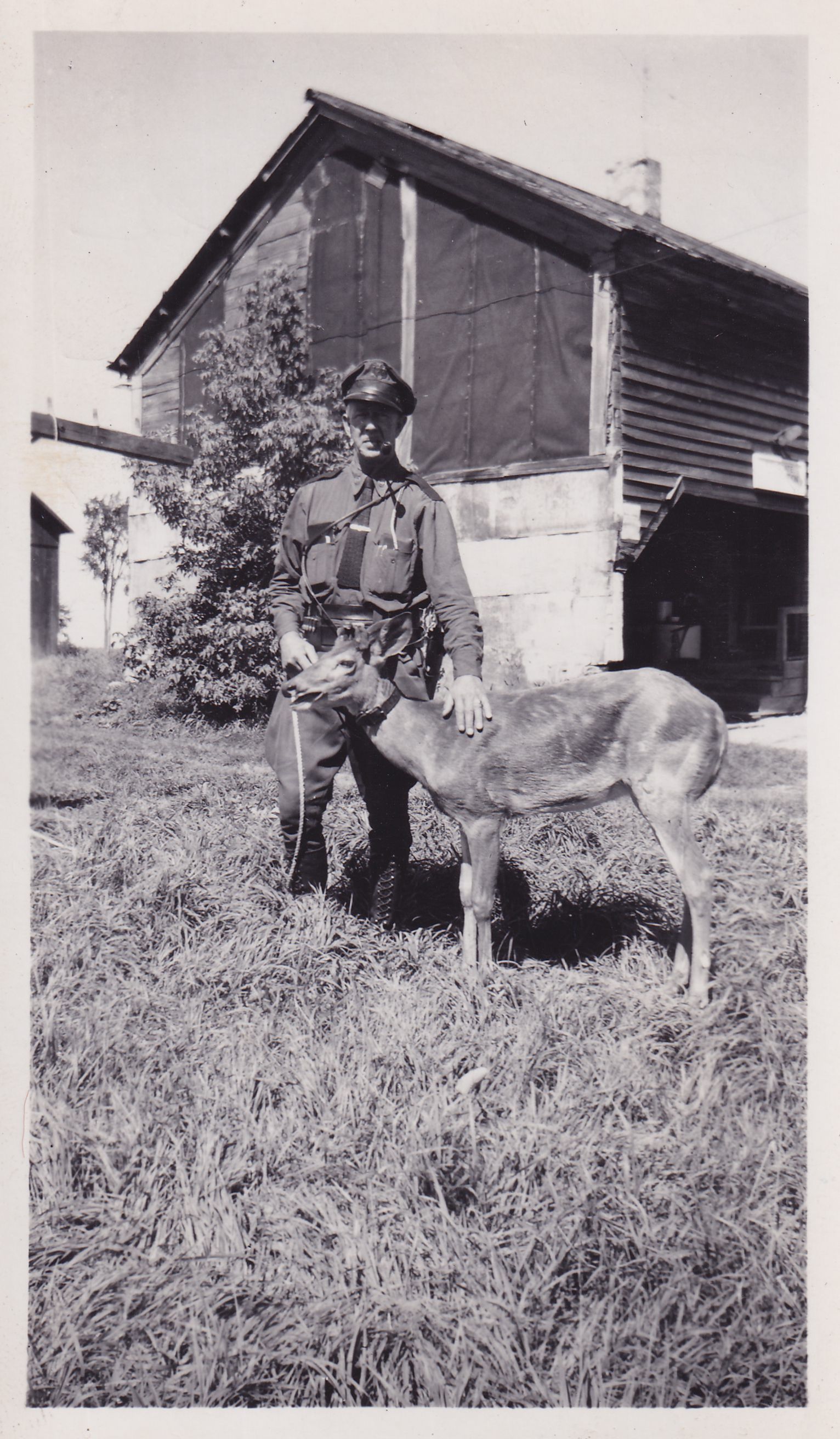 Black-and-White photograph of a man in game warden uniform standing with a deer on a leash. Handwritten caption on back reads, "Ralph Milne - Tame deer he picked up in August, 1949."