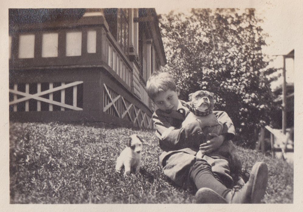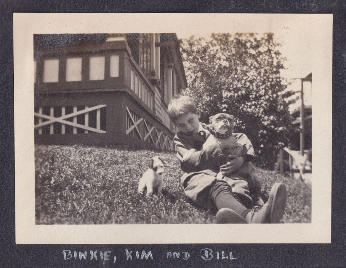 Black and white photograph of a boy in a suit holding one dog in his lap with a puppy sitting in the grass next to him. They are in the front or side yard of a house, which can partially be seen behind them. Beneath the photo there is the caption, "Binkie, Kim and Bill."