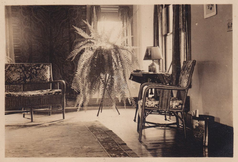 Black-and-White photograph of the interior of the second residence of the Jones Family in Saranac Lake, an unidentified cure cottage on Lake Street. It may be 453 Lake Street. The cottage was rented furnished.