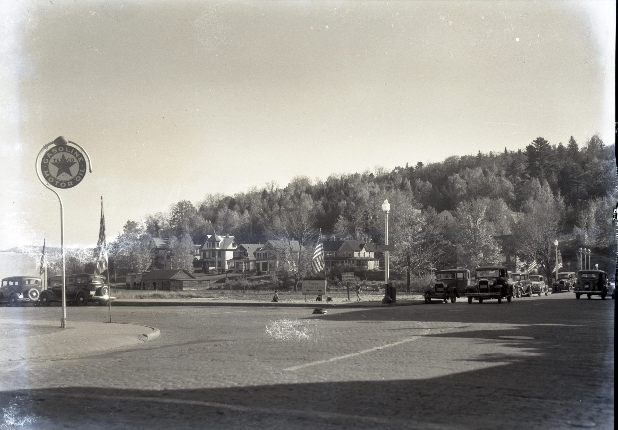 Black-and-White nitrate negative of the intersection of Main and River Streets. The former site of the Riverside Hotel is an open field, and a sign mounted on a post reads, "this site to be used for village park." There are children playing on the site, and 1930s-era cards line the streets. A Texaco sign is visible on the left corner of the intersection, and houses on Kiwassa Road can be seen in the distance. Was in envelope marked, "Saturday October 12, 1935. Riverside from Town Hall." Photograph may have been taken by William Kollecker, or for Kollecker's studio.Photograph Details
