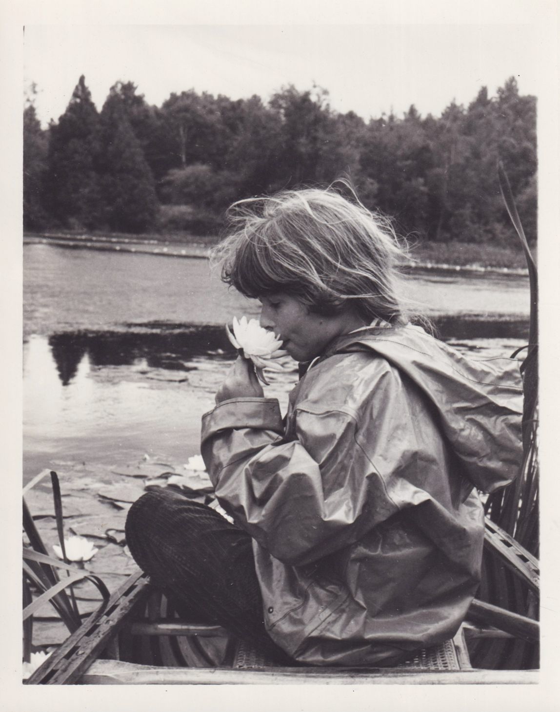 Black-and-White photograph of an unidentified young person seated in a canoe, smelling a water lily flower. There is a thumbnail sized print of a view from a cabin porch glued to the back.
