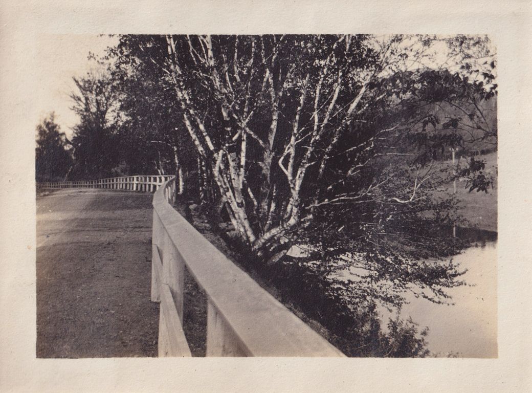 Black-and-white photograph of a dirt road and the river or lake that lines one side of the road. There is a wooden fence between the road and the shoreline. There is a widely growing tree on the shoreline.