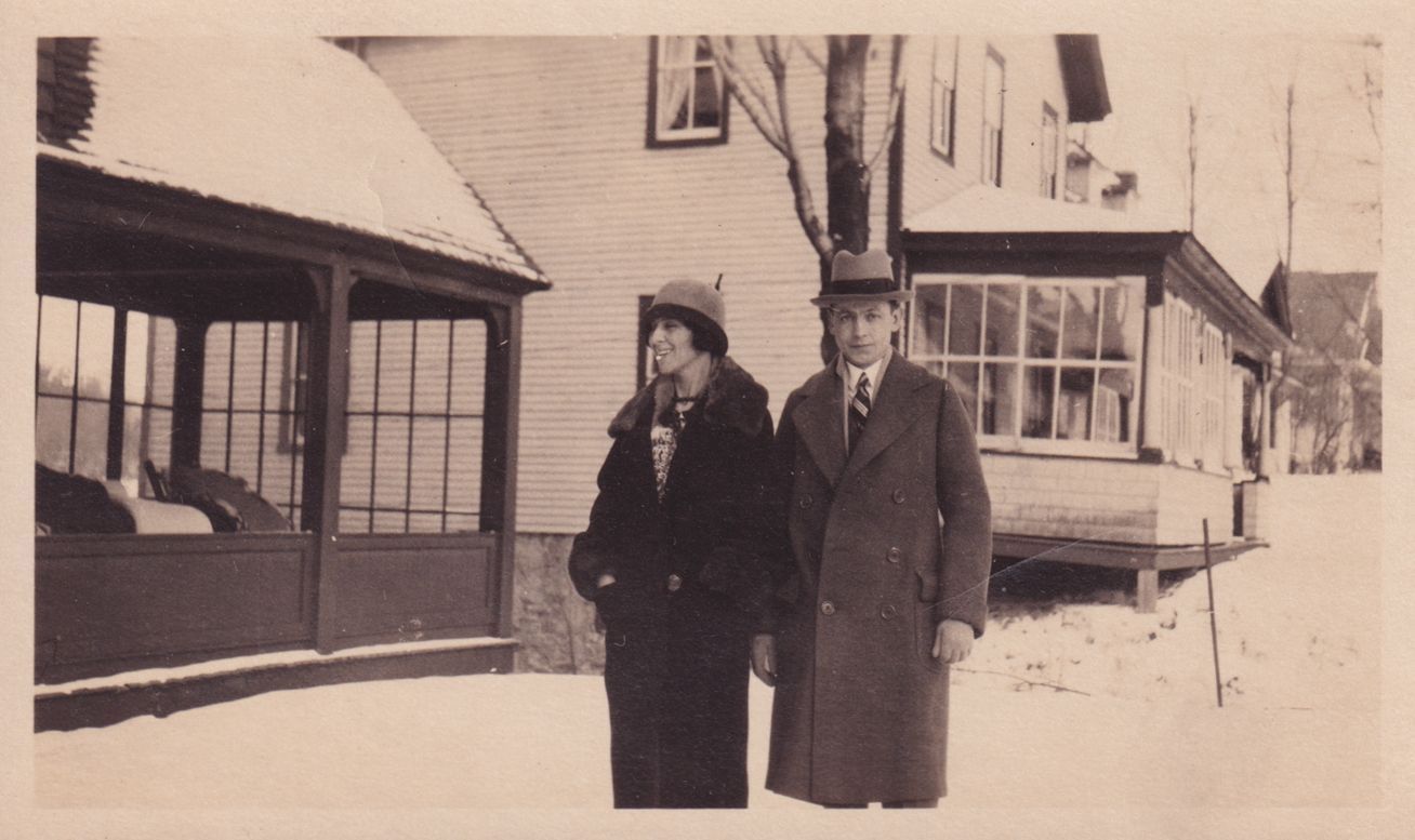 Black and white photograph of a man and a woman, both in winter gear, standing on the front lawn of a cure cottage. The edge of the front porch can be seen to the left of the couple, and another cure cottage can be seen behind them.