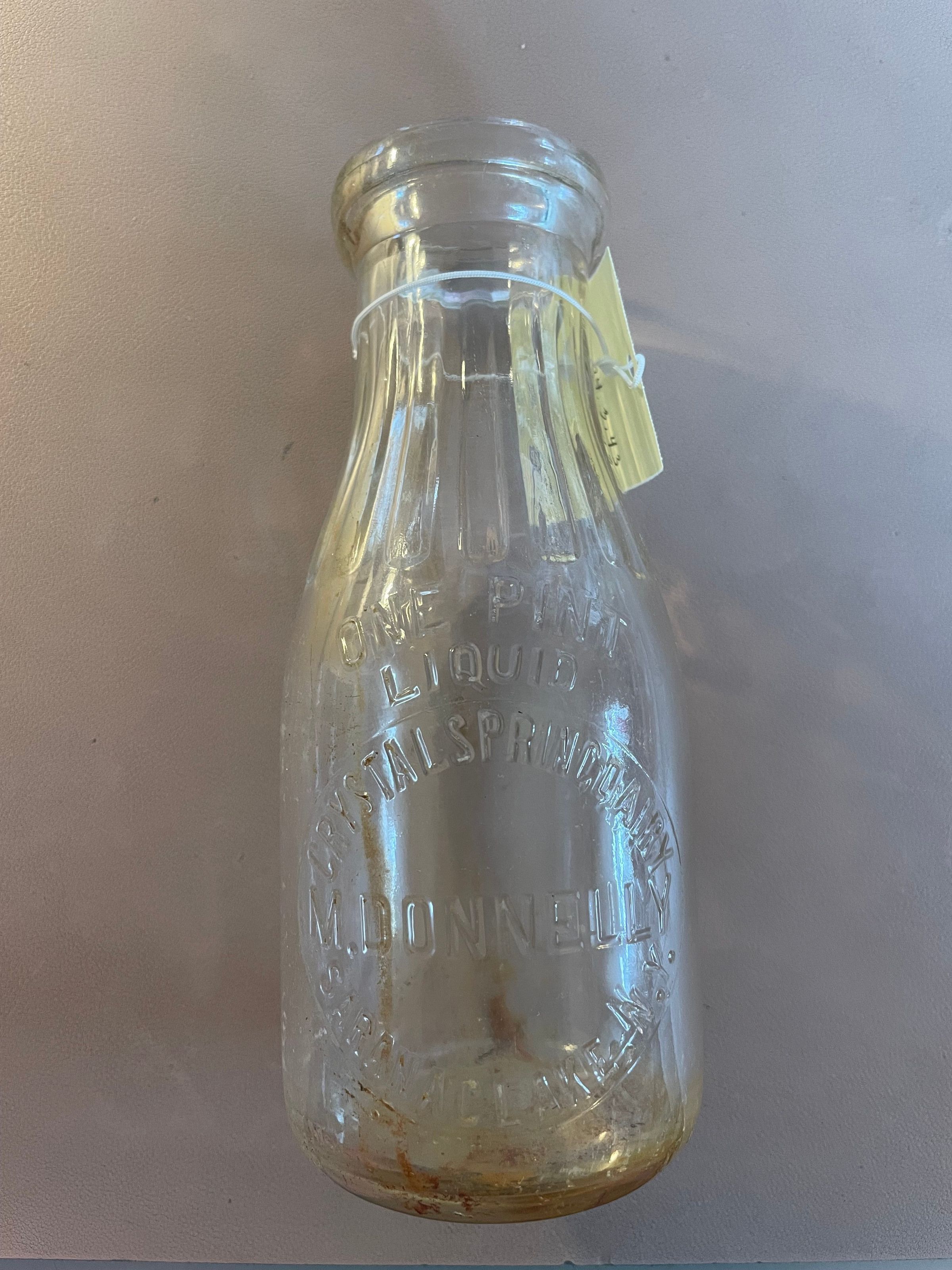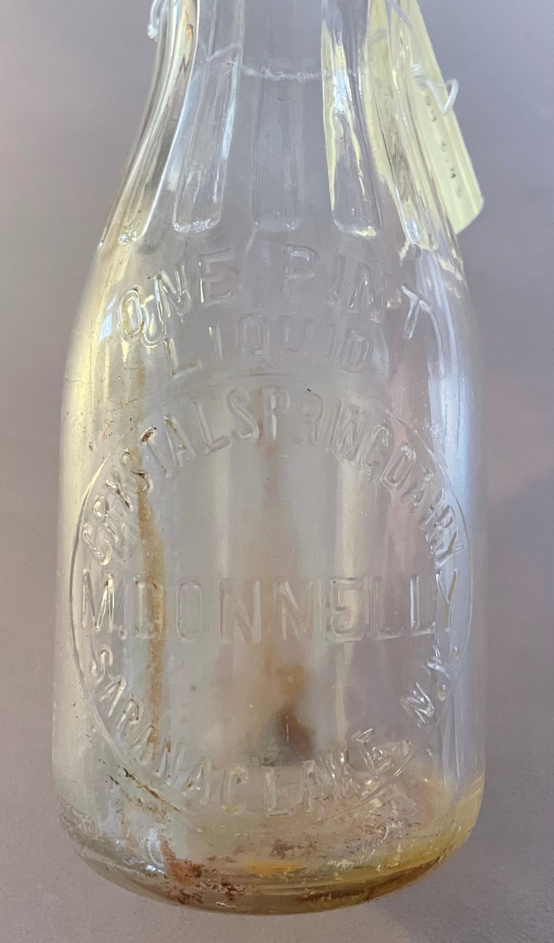 Clear glass pint milk bottle from Crystal Spring Dairy/Donnelly's. Raised lettering on front reads, "One Pint, Liquid. Crystal Spring Dairy. M. Donnelly. Saranac Lake, N. Y."