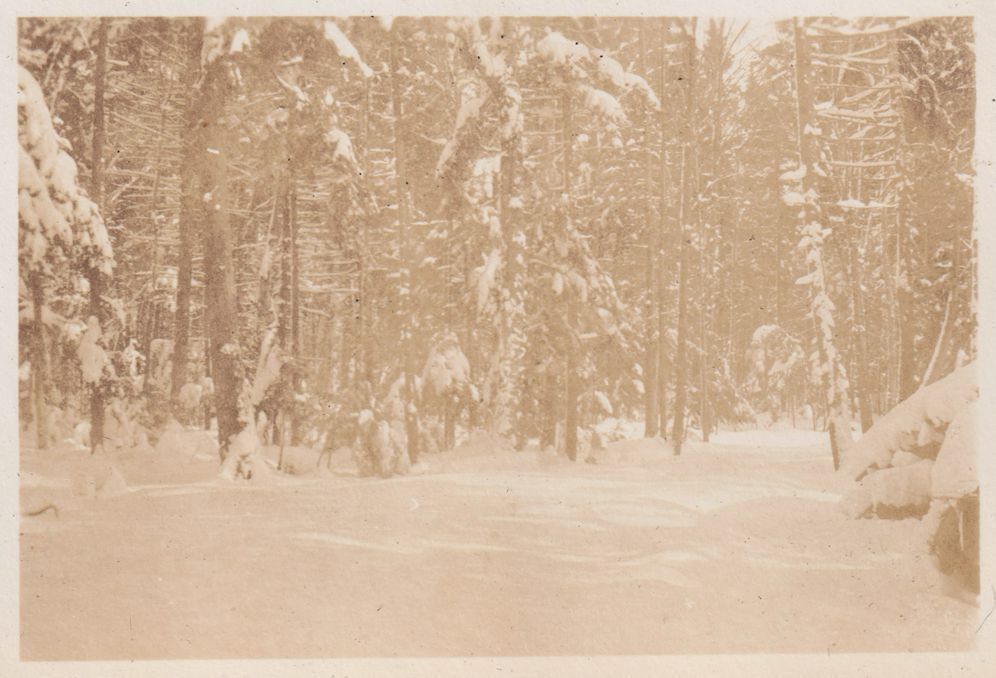 Black-and-White photograph of snowy forest scene. Part of album 2024.21.1, kept by Amy Jones and David Blair Jones c. 1930-1934.