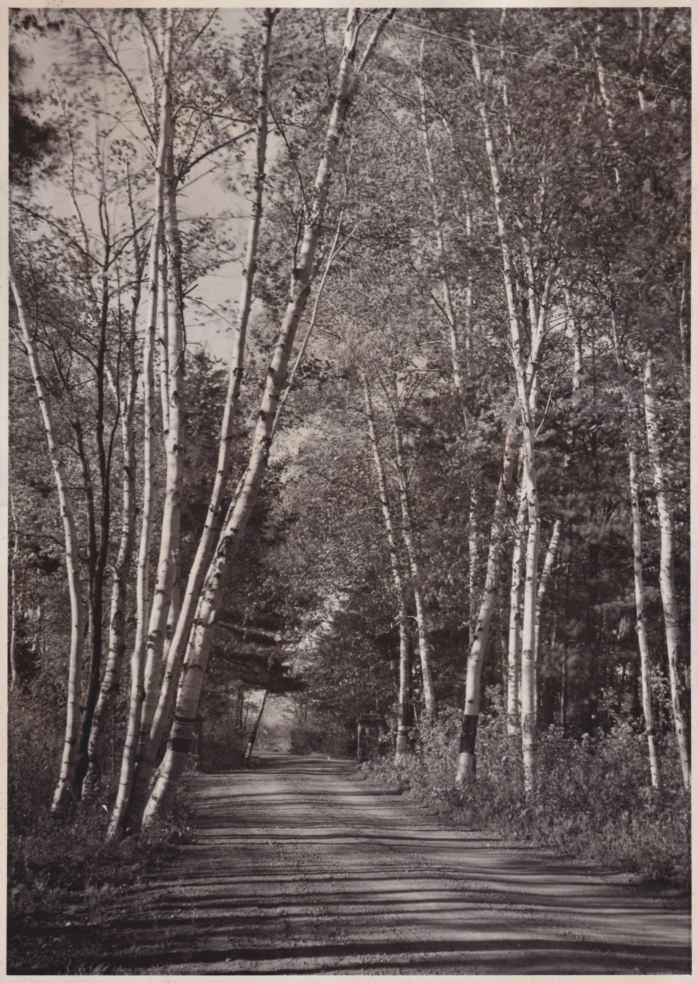 Black-and-White photograph showing an unidentified road through a birch forest.