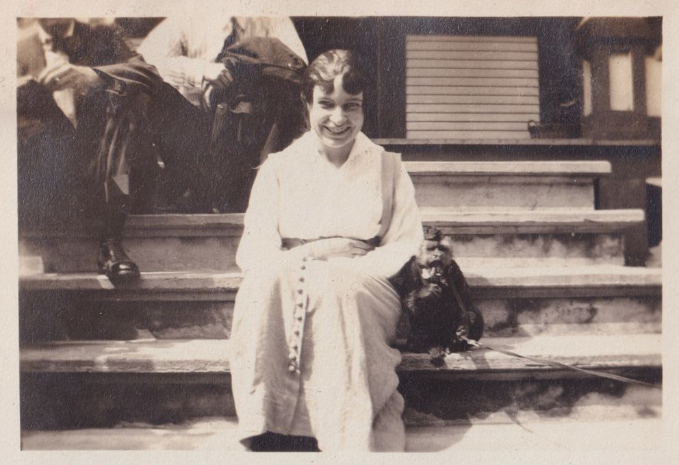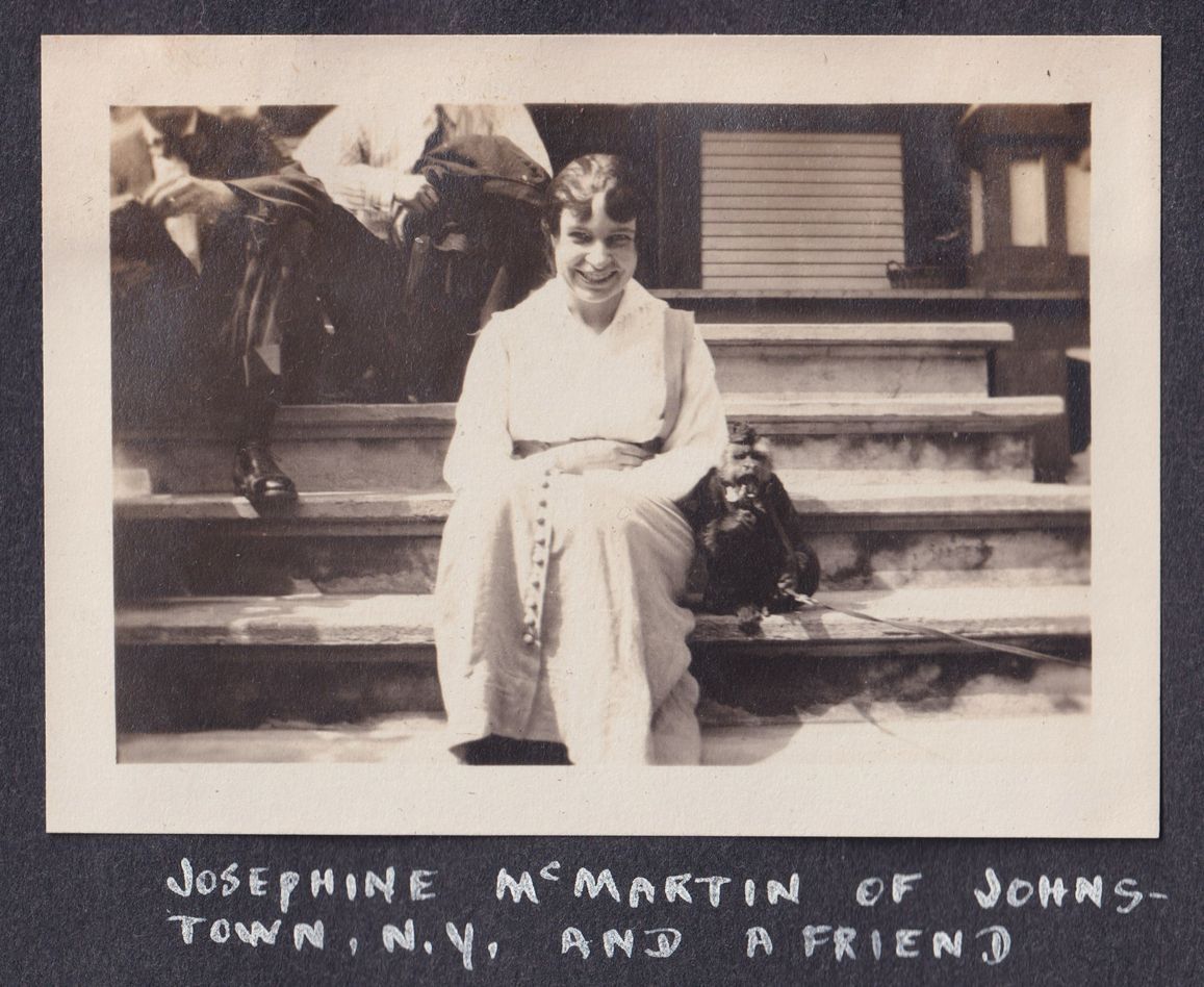 Black and white photograph of a woman sitting next to a small monkey wearing a hat. They are seated on steps leading up to a house and there are unknown people behind them. Beneath the photo is the caption, "Josephine McMartin of Johnstown, N.Y. and a Friend."