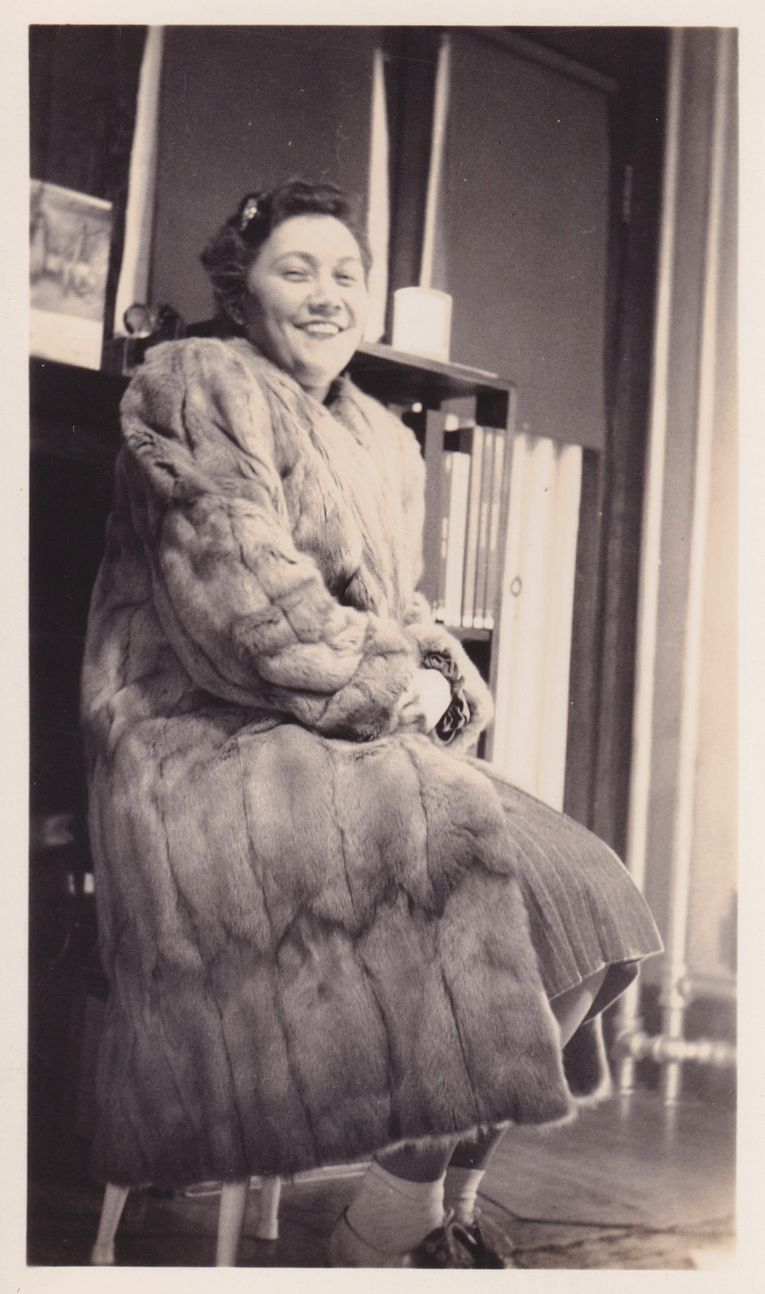 Black-and-White photograph of an unidentified woman in a fur coat. She is seated indoors and a bookcase is visible behind her. The photograph was likely printed by Kollecker's Kodak and Gift Shop.