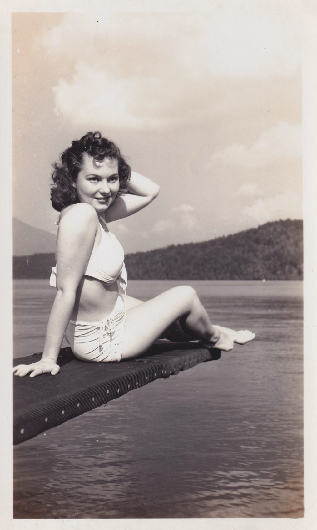 Black-and-White photograph of a woman, most likely Ruth McClellan, in a bikini seated on a diving board over an unidentified body of water. She is turning toward the camera with her arm up behind her head. The photograph was likely printed by Kollecker's Kodak and Gift Shop. [Note: this photograph was featured on tourism pamphlets for Saranac Lake.]